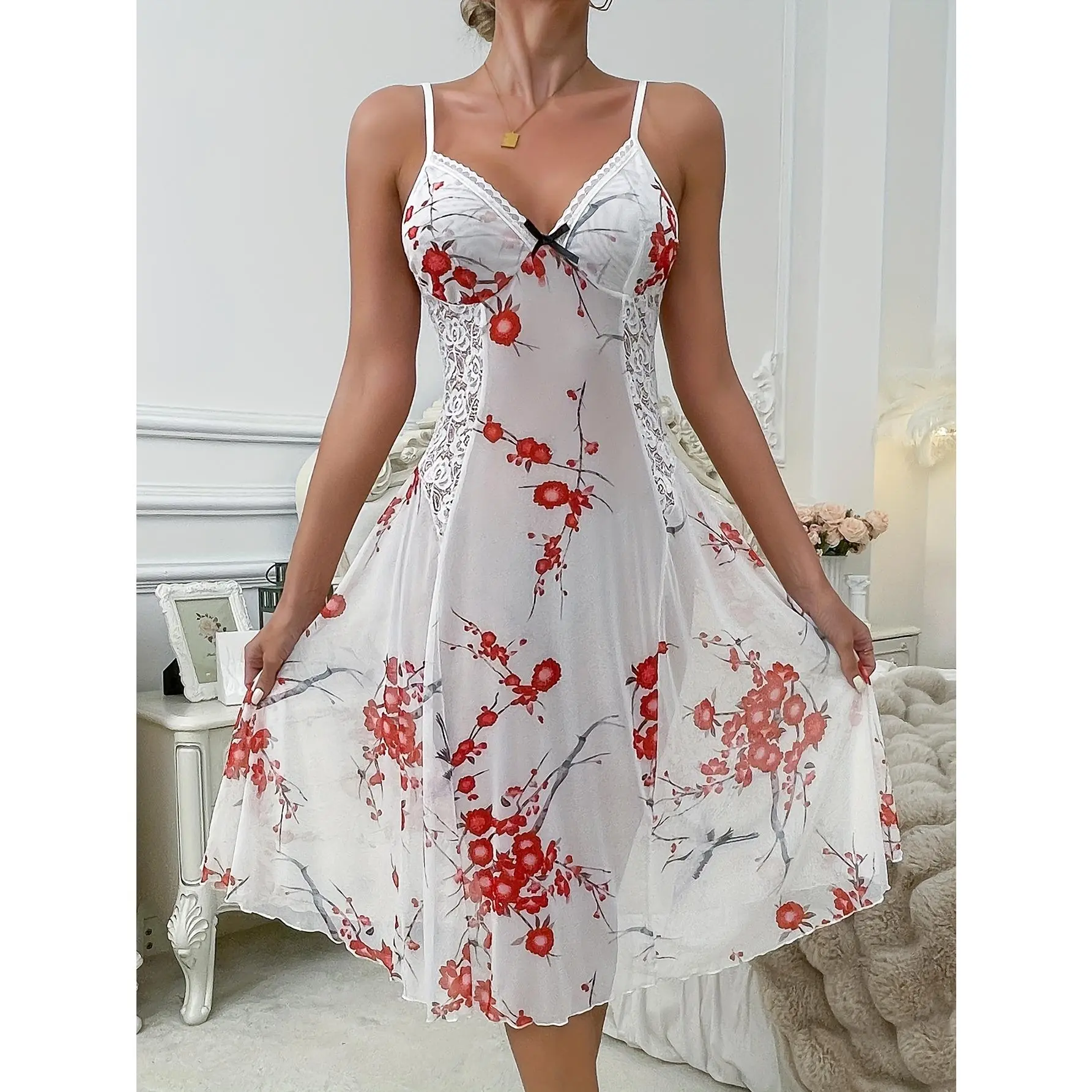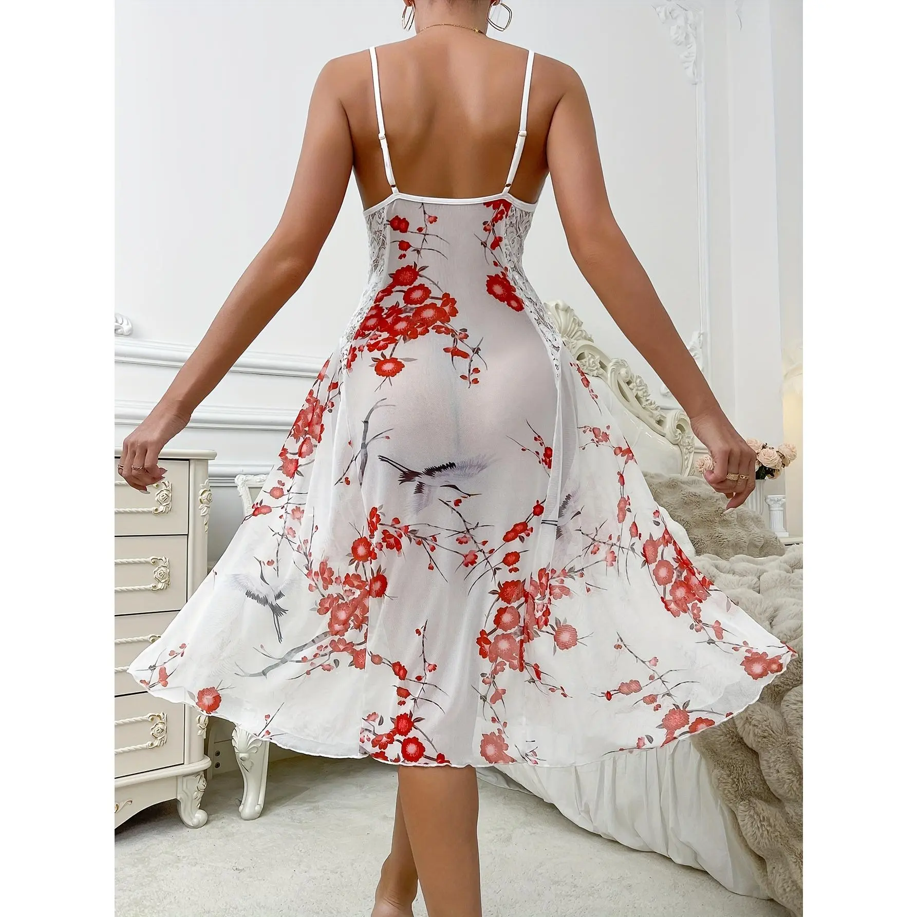 Ice Sliky Fiber Fabric Sexy Sheer Mesh Camisole Dress with Large Floral Print and Small Flowers for Women, Summer Semi-Transparent Skirt