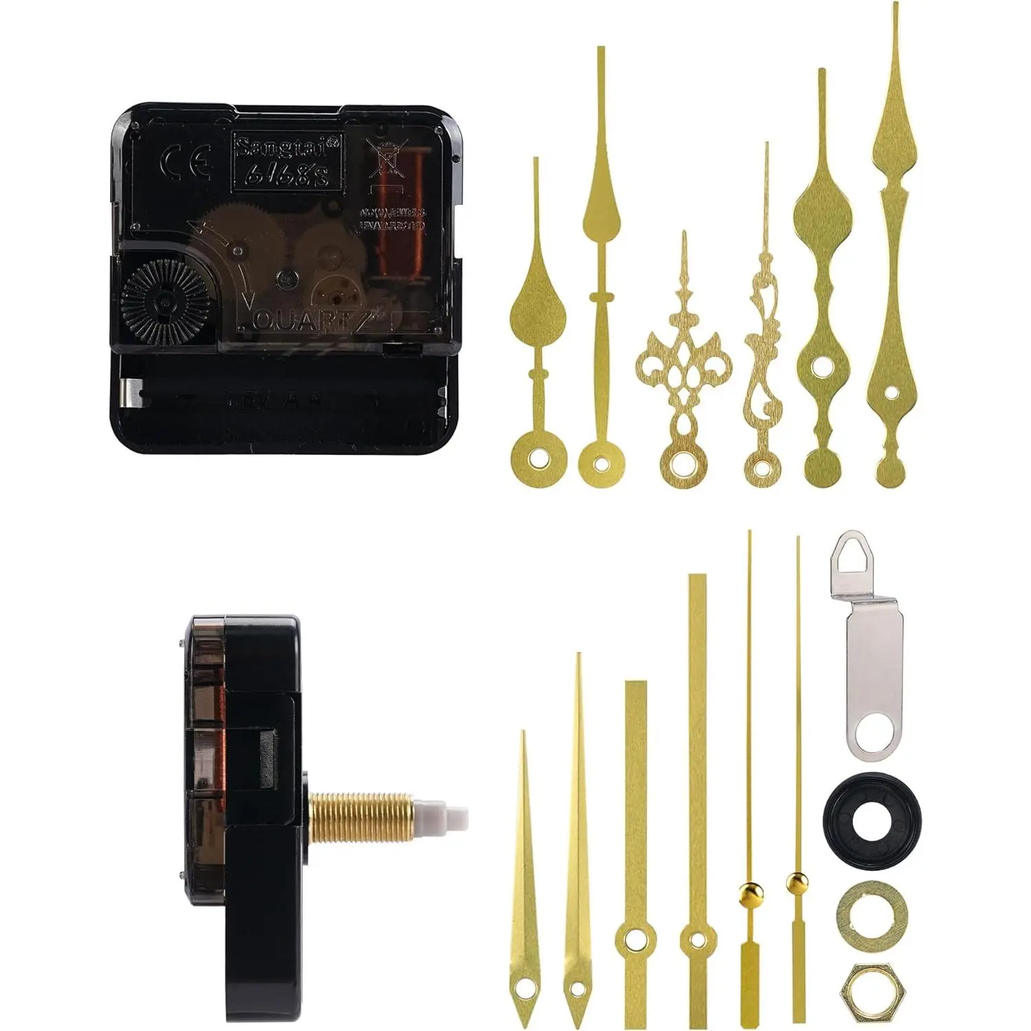 VALUE PACK - Fix more clocks, faster-2 high-torque quartz movements plus 5 pairs of gold hands-complete clock parts kit for DIY wall clock repair, replacement, or new builds.