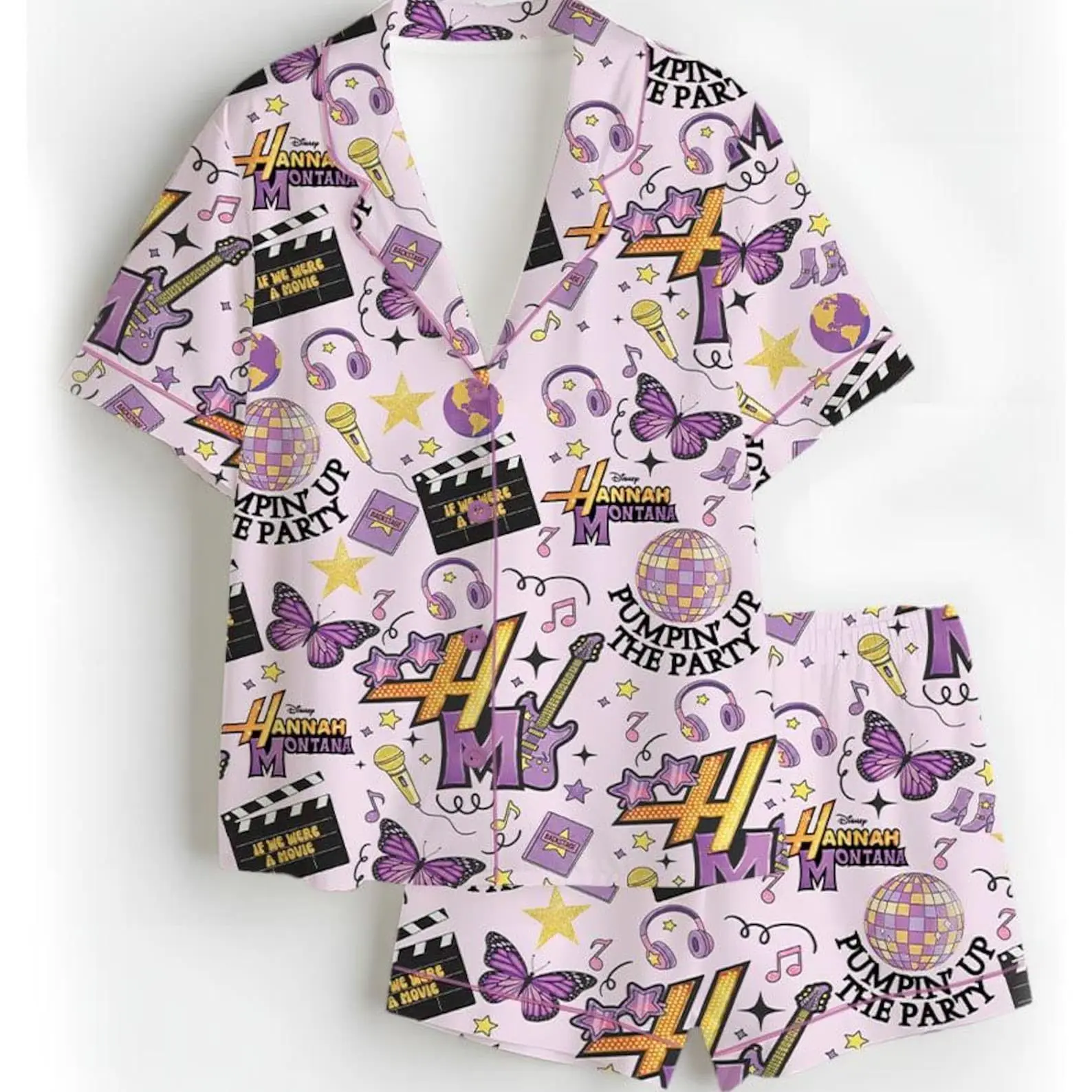 Hannah Montana Anniversary Satin Pajama Set, Silky Smooth Fabric, Short Sleeve Button Top, Elastic Shorts, Cute Gift Lounge Sleepwear
