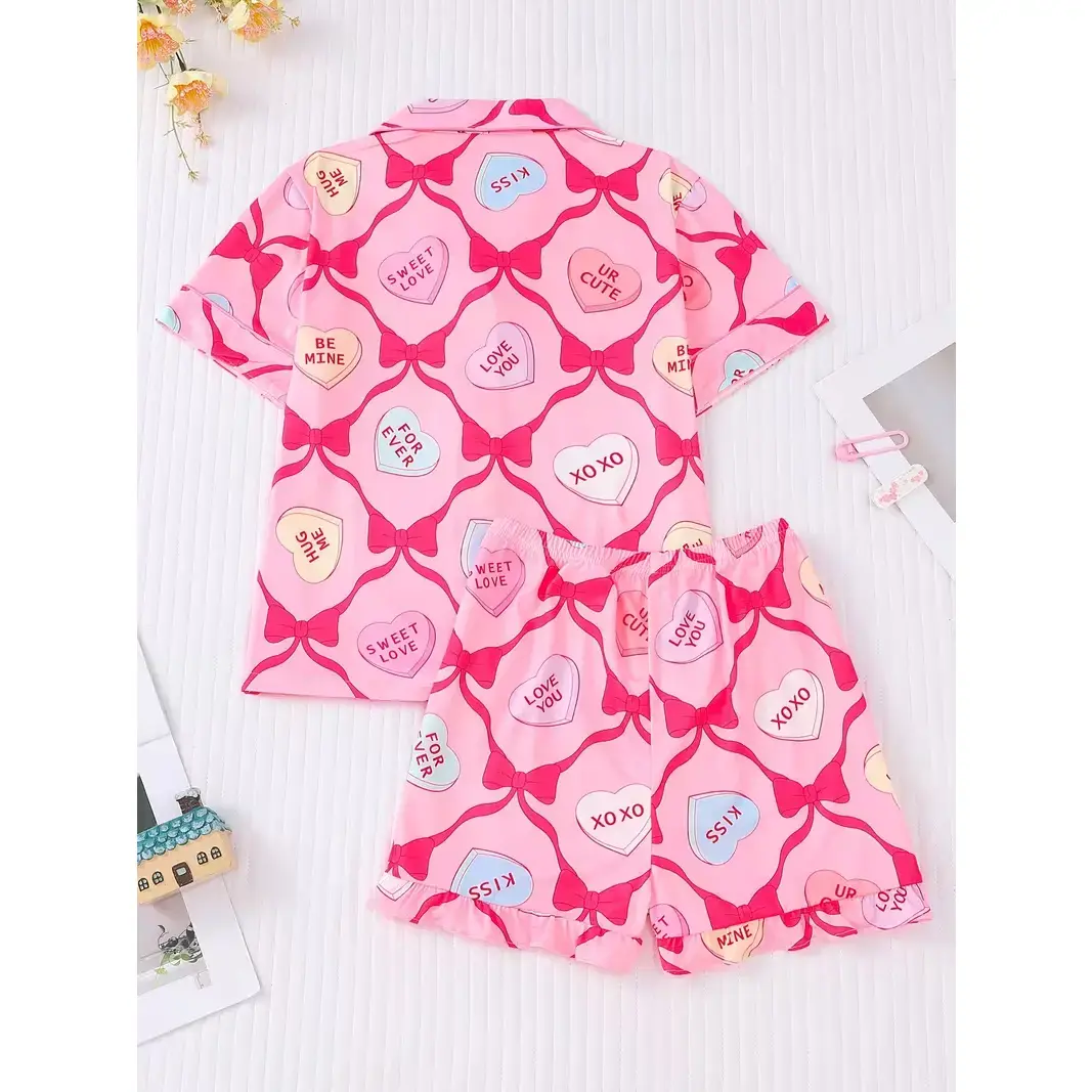 5. Heart Bow Print Girls Pajama Set, 2pcs Short Sleeve Top with Shorts, Cute Soft Loungewear for Daily Wear Sleepover Gift Idea