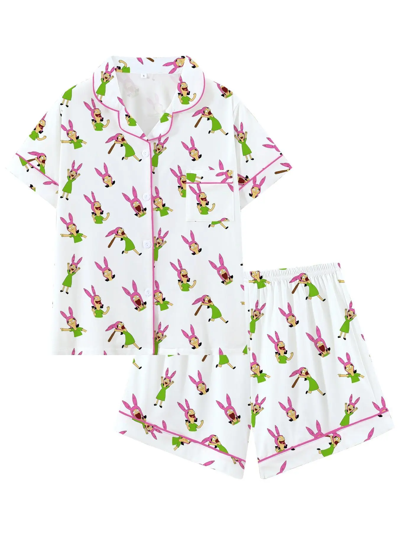 Bobs Burgers Louise Print Pajama Set, Short Sleeve Collared Top, Elastic Waist Shorts, Fun Cartoon Lounge Wear, Cute Sleep Outfit Gift