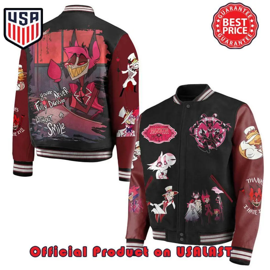 Hazbin Hotel Smile Varsity Jacket, Anime Bomber Featuring Signature Character Art, Trendy Streetwear Gift For Fans Who Love Bright Graphic Outerwear