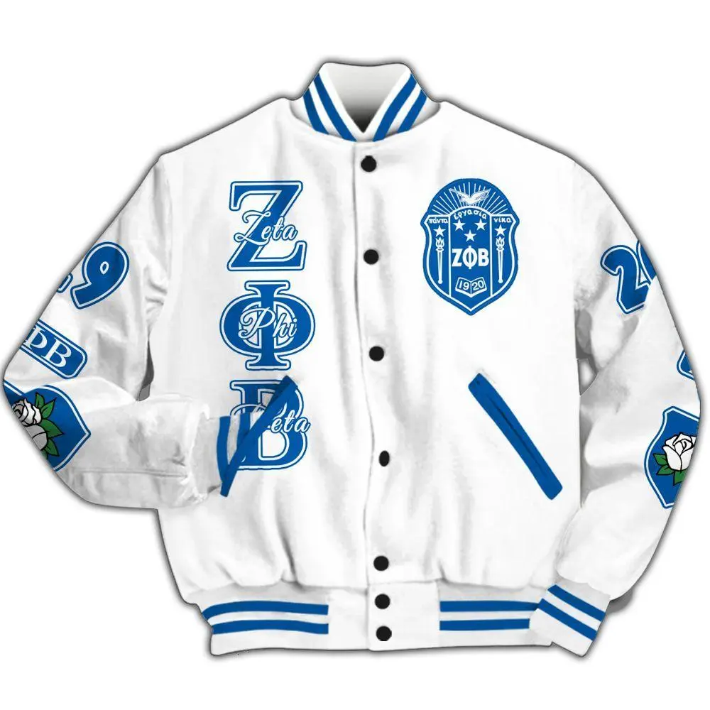 Zeta Phi Beta Varsity Jacket, Hand Sign White Rose 1920 Sorority Letterman, Personalized ZΦΒ Greek Apparel, Unique Finer Womanhood Sisterhood Gift