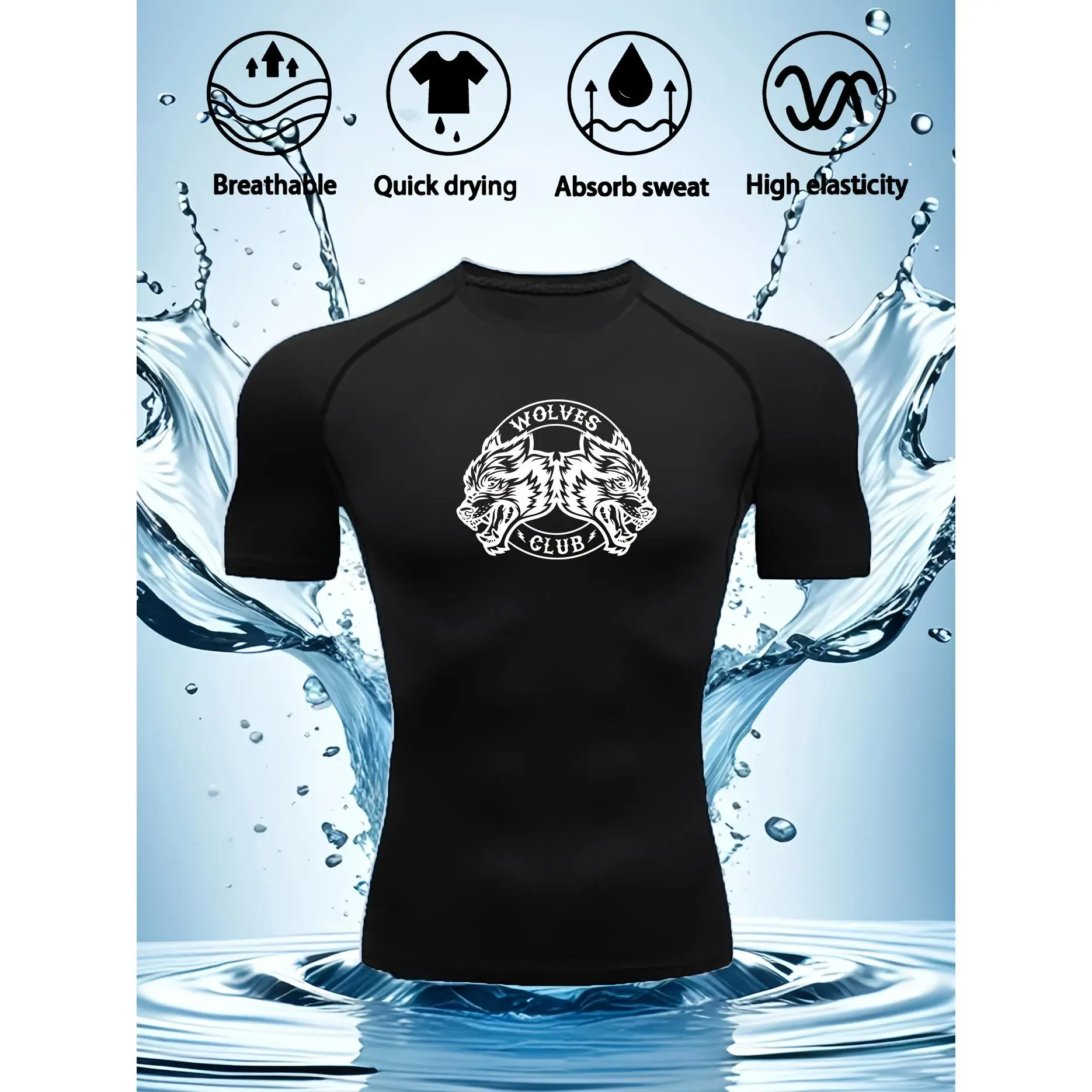 WOLVES Wolf Head Print Men's Crew Neck T-Shirt - Quick-drying, breathable, sweat-absorbing shirt, suitable for fitness, gym, and running, lightweight and comfortable, quick-drying short-sleeve moisture-wicking shirt for sports and fitness training