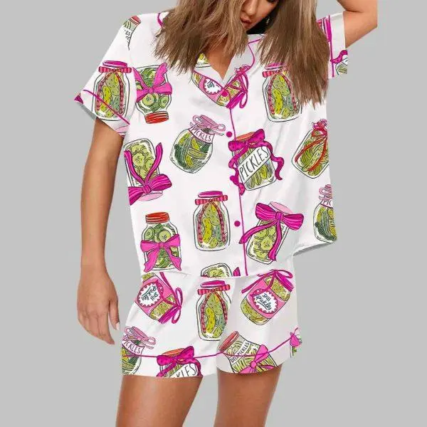 Pickle Lover Short Sleeve Satin Pajama Set for Women, Coquette Bow Sleepwear, Cute Foodie Gift