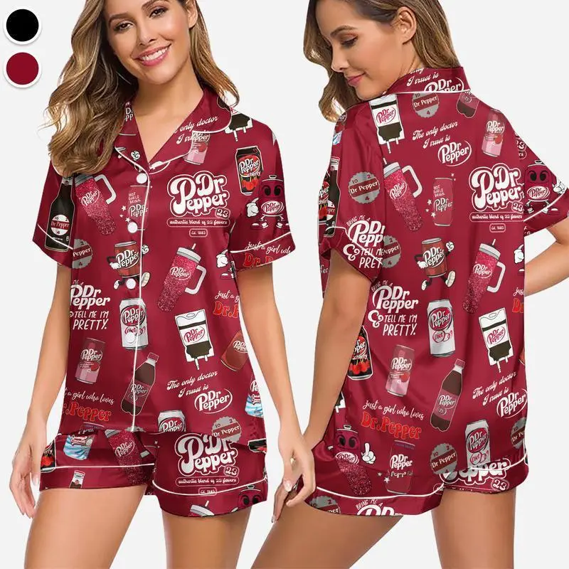 Dr Pepper Satin Pajama Set for Women, Silky Soda Lover Sleepwear, Cozy Beverage Lounge Outfit, Unique Collector Gift