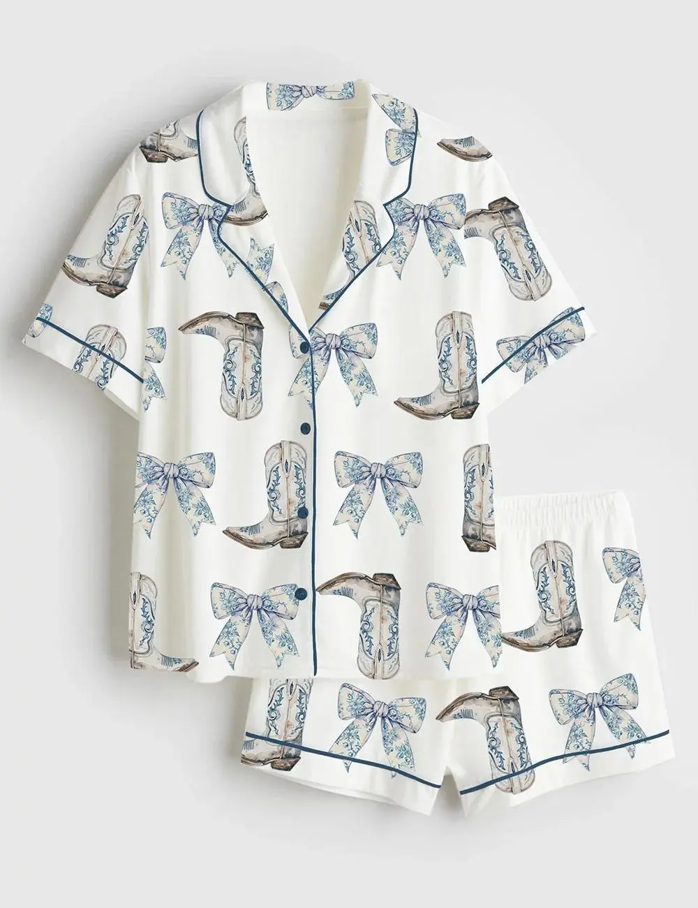 Coquette Blue Bow Cowgirl Satin Pajama Set for Women, Bridal Silky Sleepwear, Cute Holiday Lounge Outfit, Wedding Gift