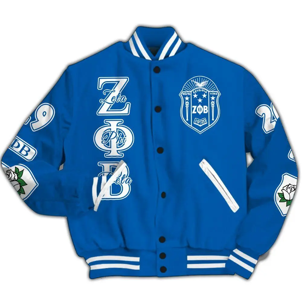 5. Zeta Phi Beta Varsity Jacket, Hand Sign White Rose Royal Blue Letterman, 1920 Sorority Greek Life Apparel, Unique ZΦΒ Finer Womanhood Gift Wear