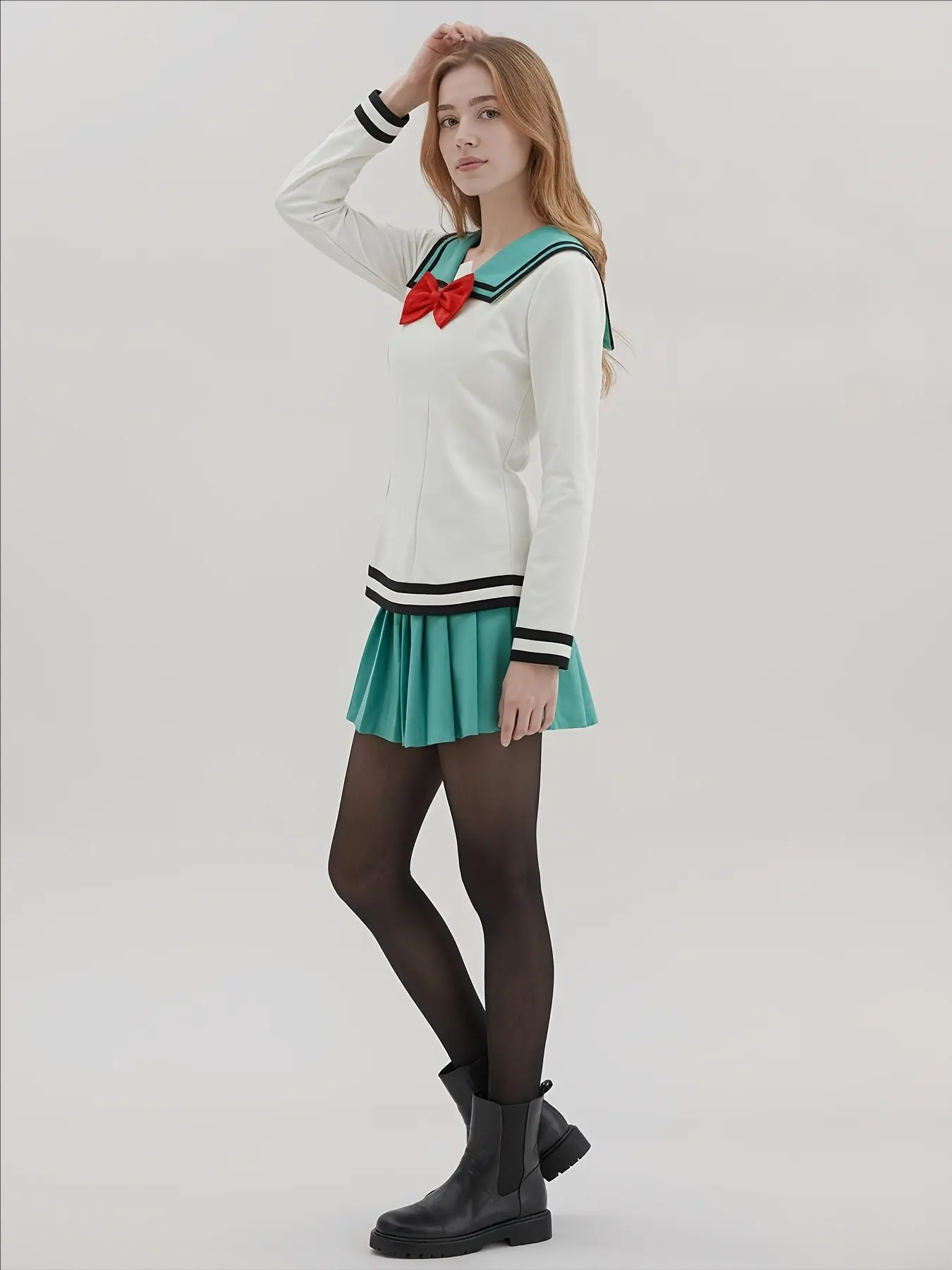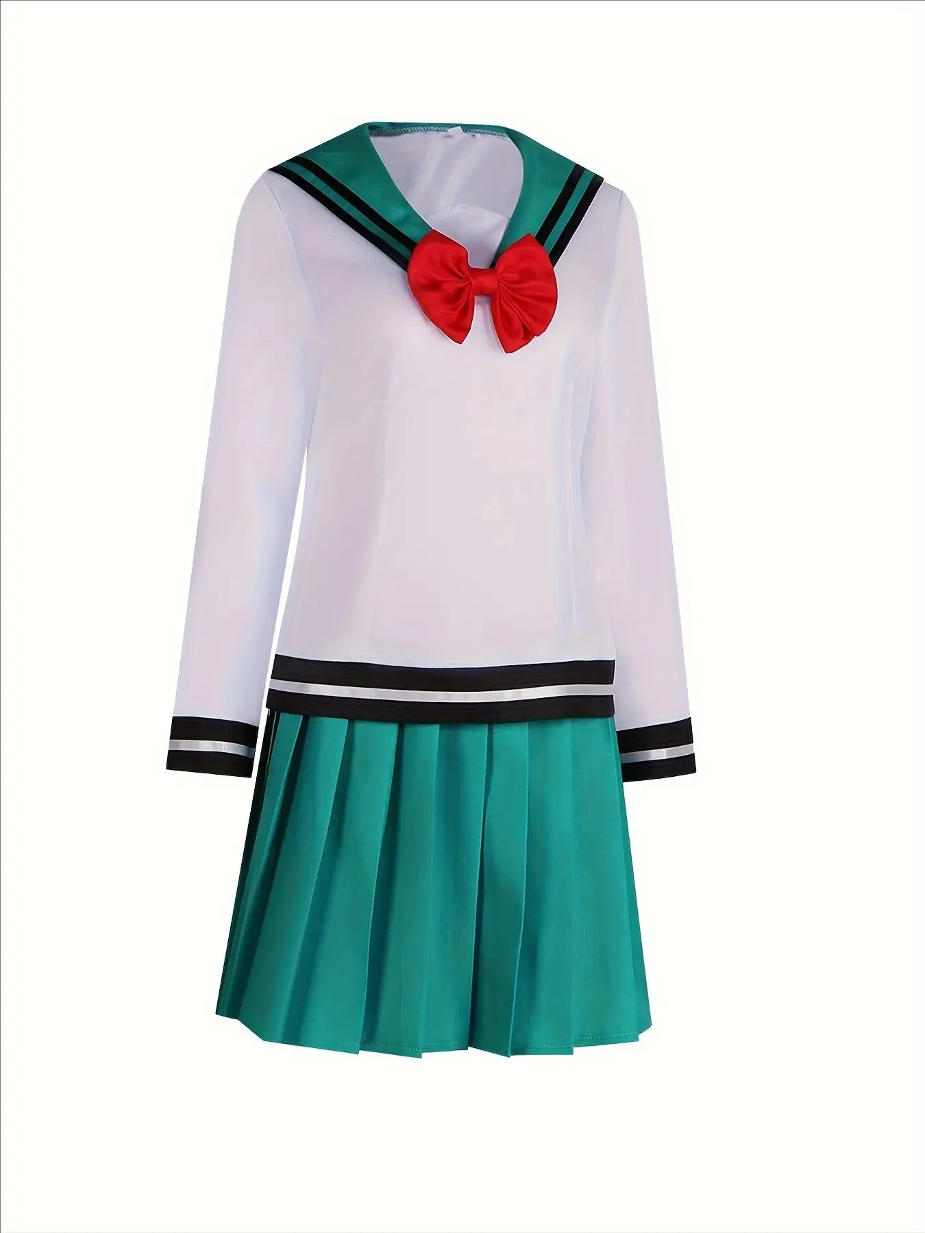 【Detailed Design】: Includes a red bow tie and pleated skirt, enhancing the overall aesthetic appeal.