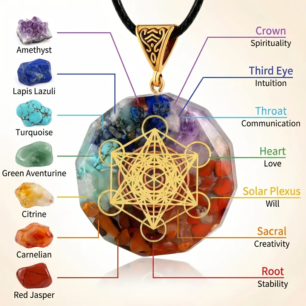 The necklace showcases a large, faceted orgonite pendant, inlaid with a gold Metatron's Cube symbol and a rainbow of 7 chakra stones, suspended from a durable braided leather cord with an adjustable closure.The bracelet is strung with smooth, polished 7 chakra beads, each color-coded to correspond to the body's energy centers, on a stretch elastic string for a comfortable fit.