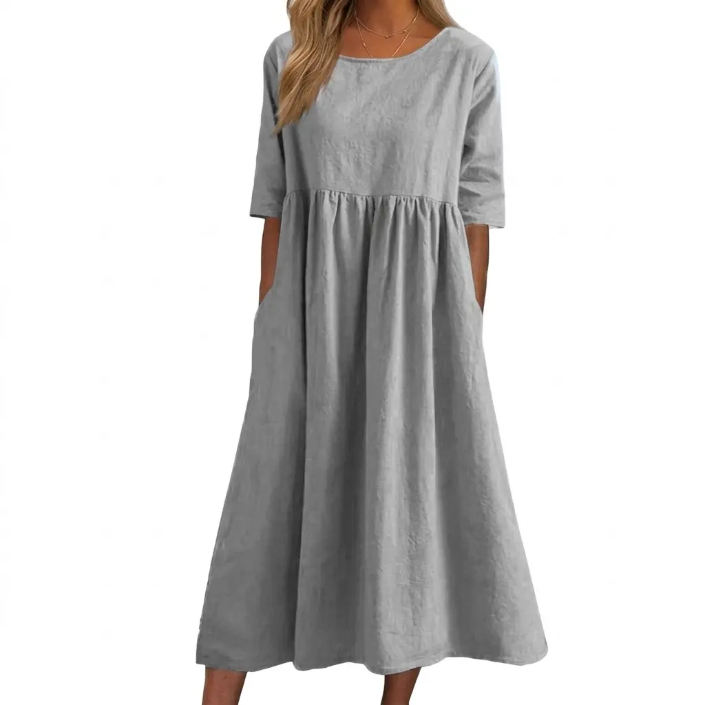 This dress is a versatile addition to your wardrobe. Its loose fit ensures comfort, making it suitable for various occasions. The short sleeves and pockets add a practical touch. Ideal for summer, it combines style with functionality. Perfect for those who love a boho vibe.
