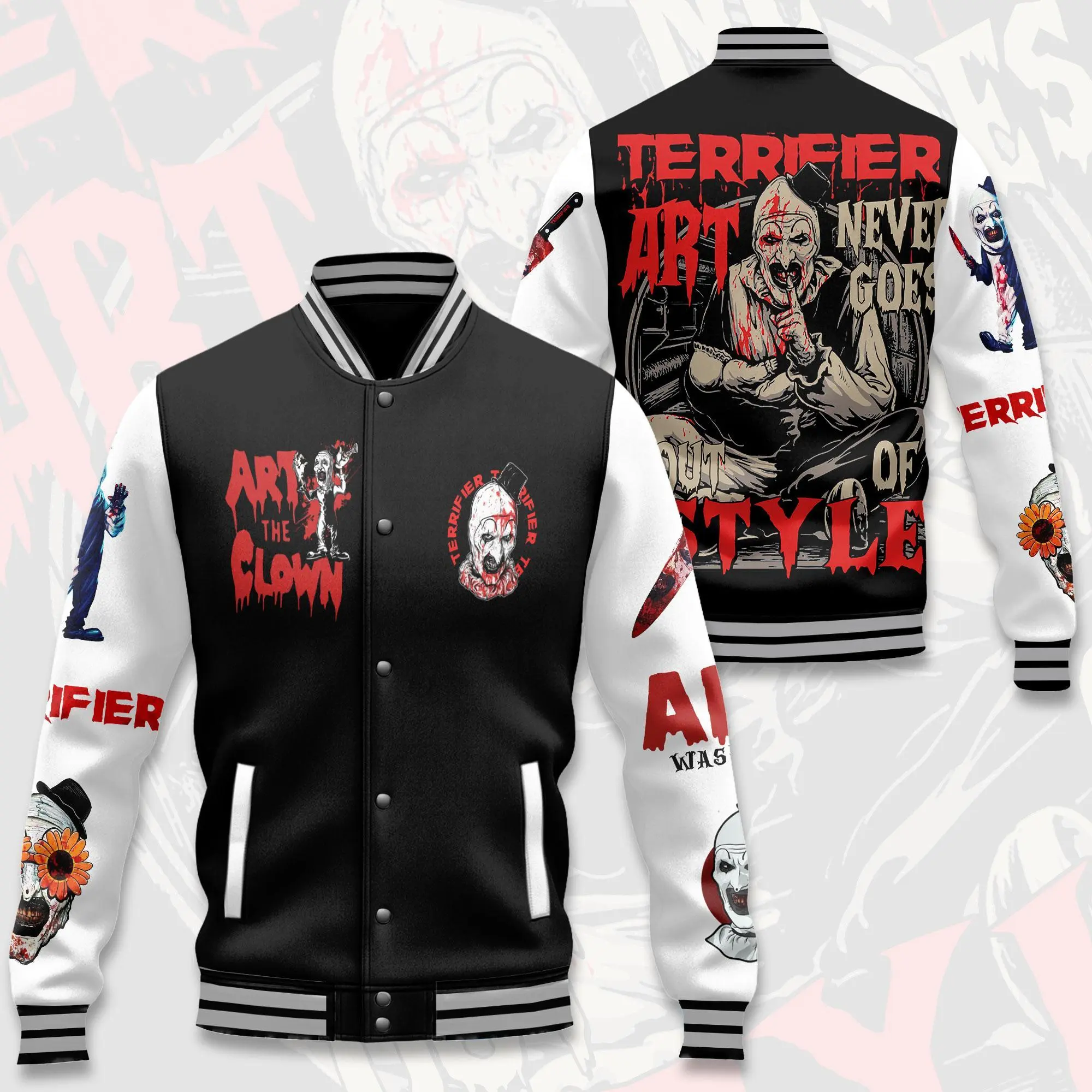 5. Terrifier Horror Varsity Jacket Clown Graphic Design, Dark Streetwear Style, Unique Fan Gift Idea