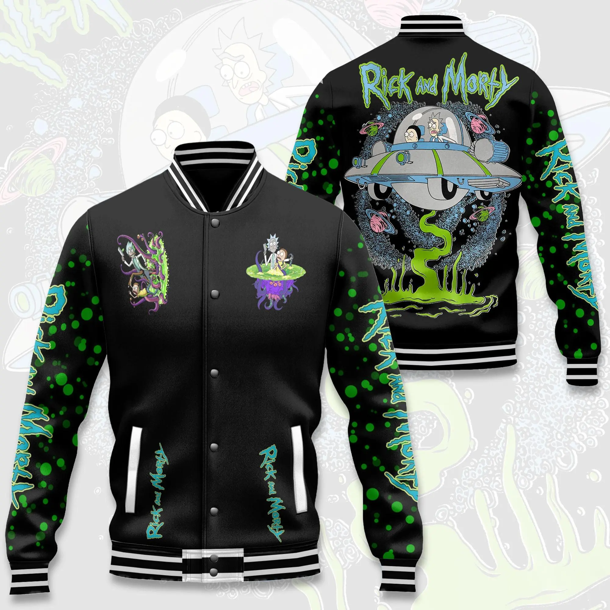 5. Rick and Morty Cartoon Varsity Jacket Graphic Print, Pop Culture Streetwear, Trendy Casual Outfit