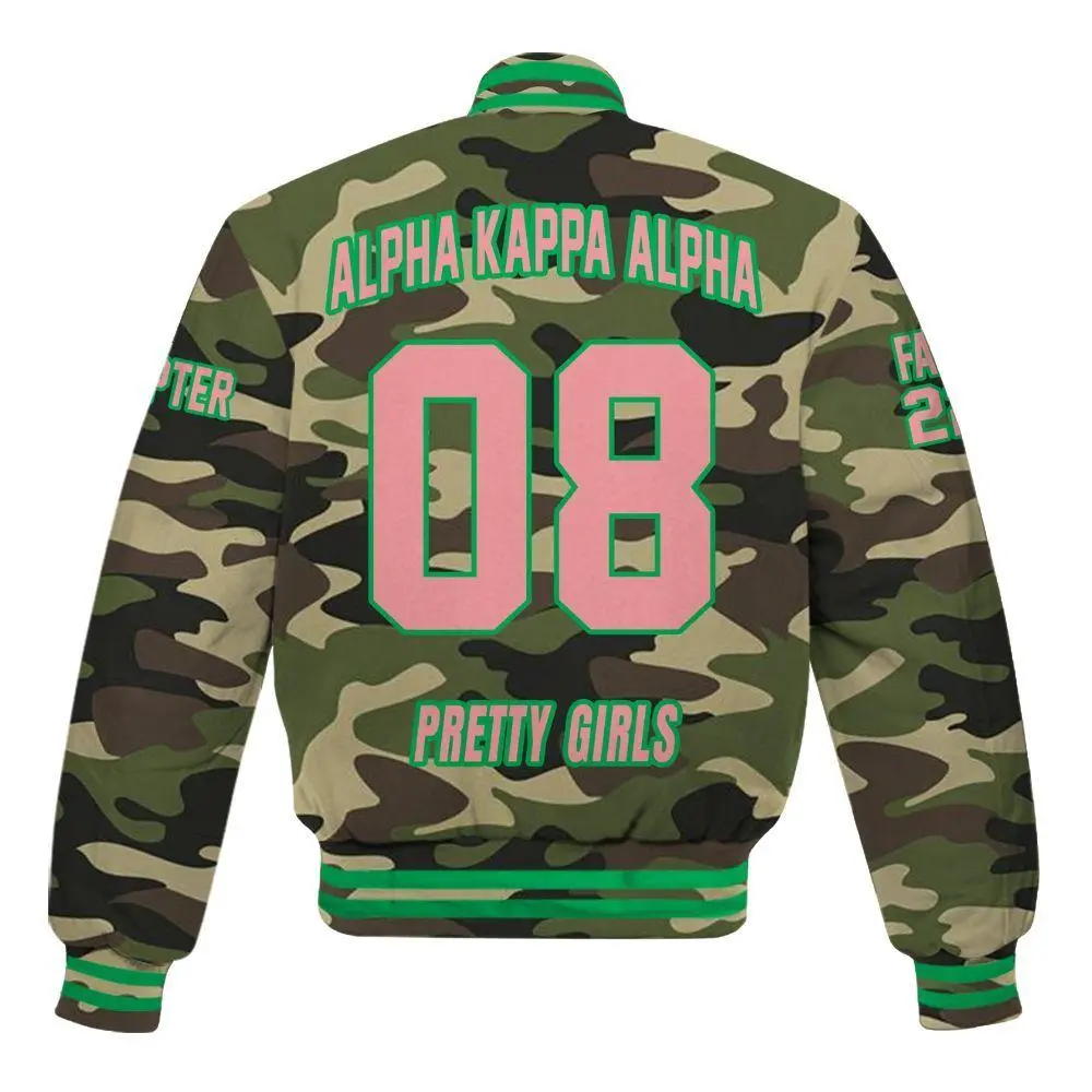 A.K.A Custom Chapter Varsity Jacket, Personalized Camo Style 1908 Sorority Letterman, Alpha Kappa Alpha Pink Green Greek Sisterhood Member Gift