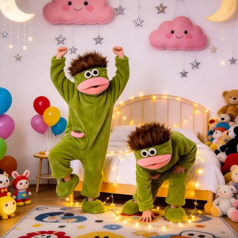 Fun Onesie Party Set, Comfortable Hooded Flannel Pajama Three-Piece Set, Includes Pajamas, Comb, and Shoe Covers, Cute Monster Pattern