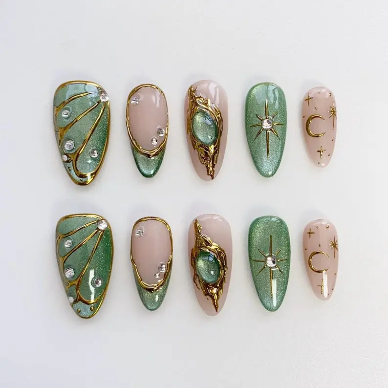 Summer Cat Eye Green Press on Nails, 3D Gold Chrome Nail, Butterfly Nails