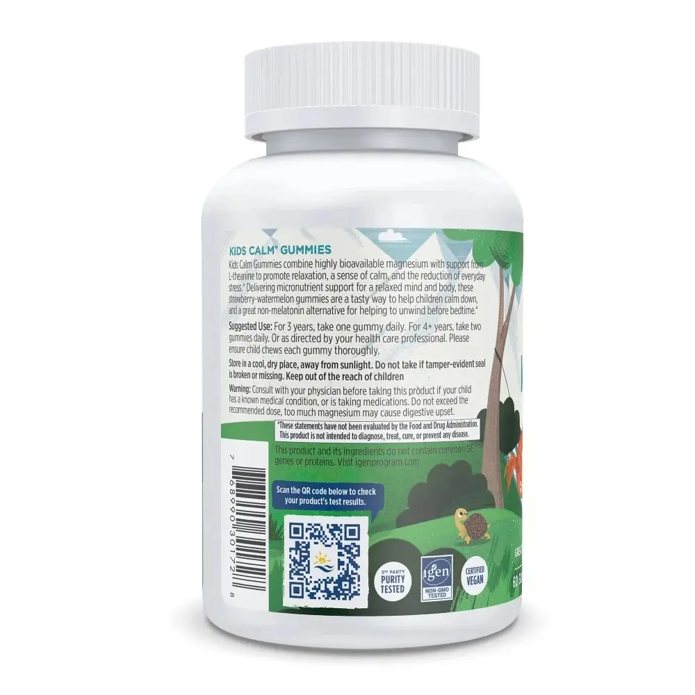 Kids Calm Gummies combines highly bioavailable magnesium with L-theanine to promote relaxation and a sense of calm, and reduce everyday stress.* Delivering micronutrient support for a relaxed mind and body, these strawberry-watermelon gummies are a tasty way to help children calm down, and provide a great non-melatonin alternative before bedtime.*