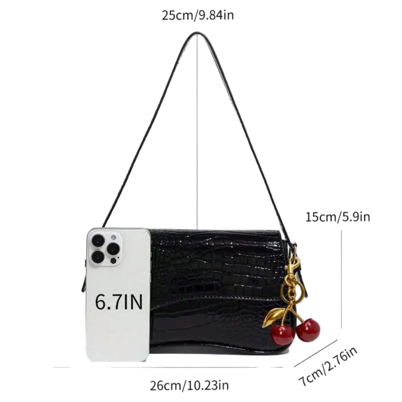 Women Faux Leather Shoulder Bag, Black Crocodile Pattern Square Bag, Versatile Patent Leather Purse, Y2K Crossbody/Underarm Bag, Fashionable Sling Bag, With Cherry Pendant Charm