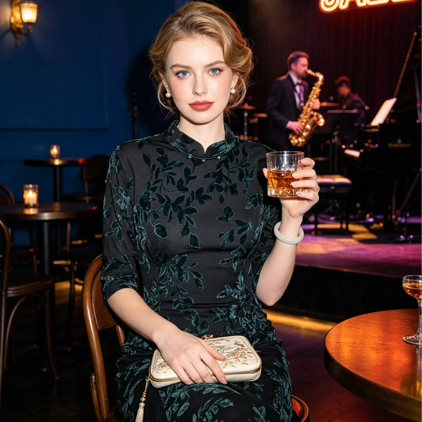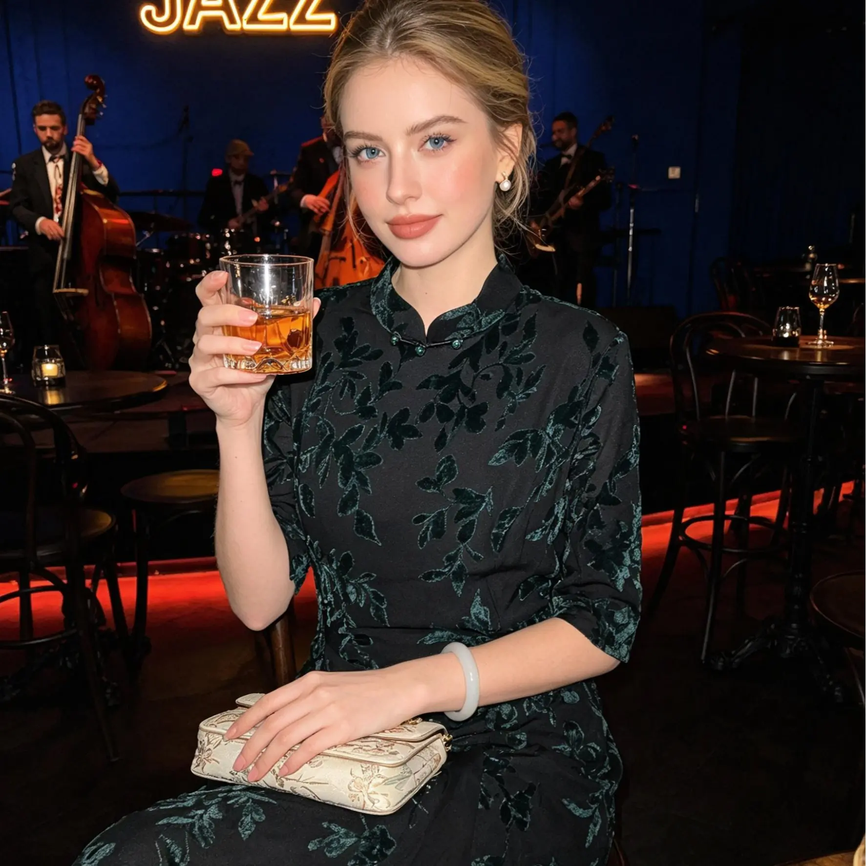 Black Base Dark Green Velvet Flocking Modified Cheongsam · Mid Sleeve Stand Collar Everyday Light Luxury Handmade Neo-Chinese Stretch Dress