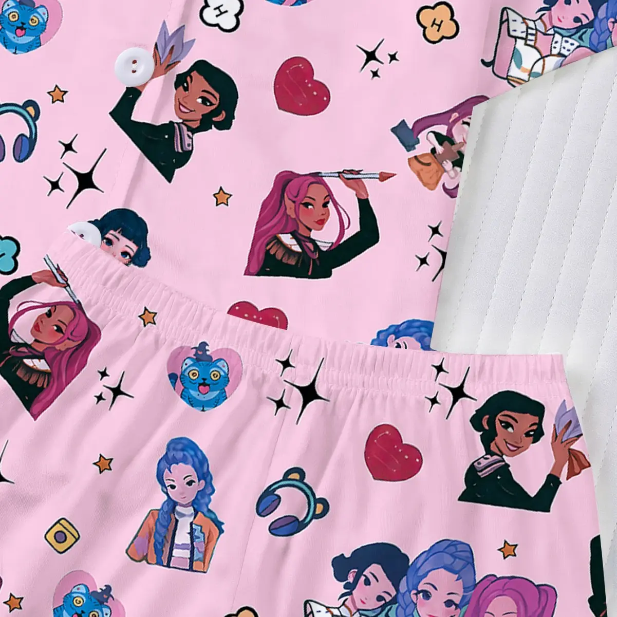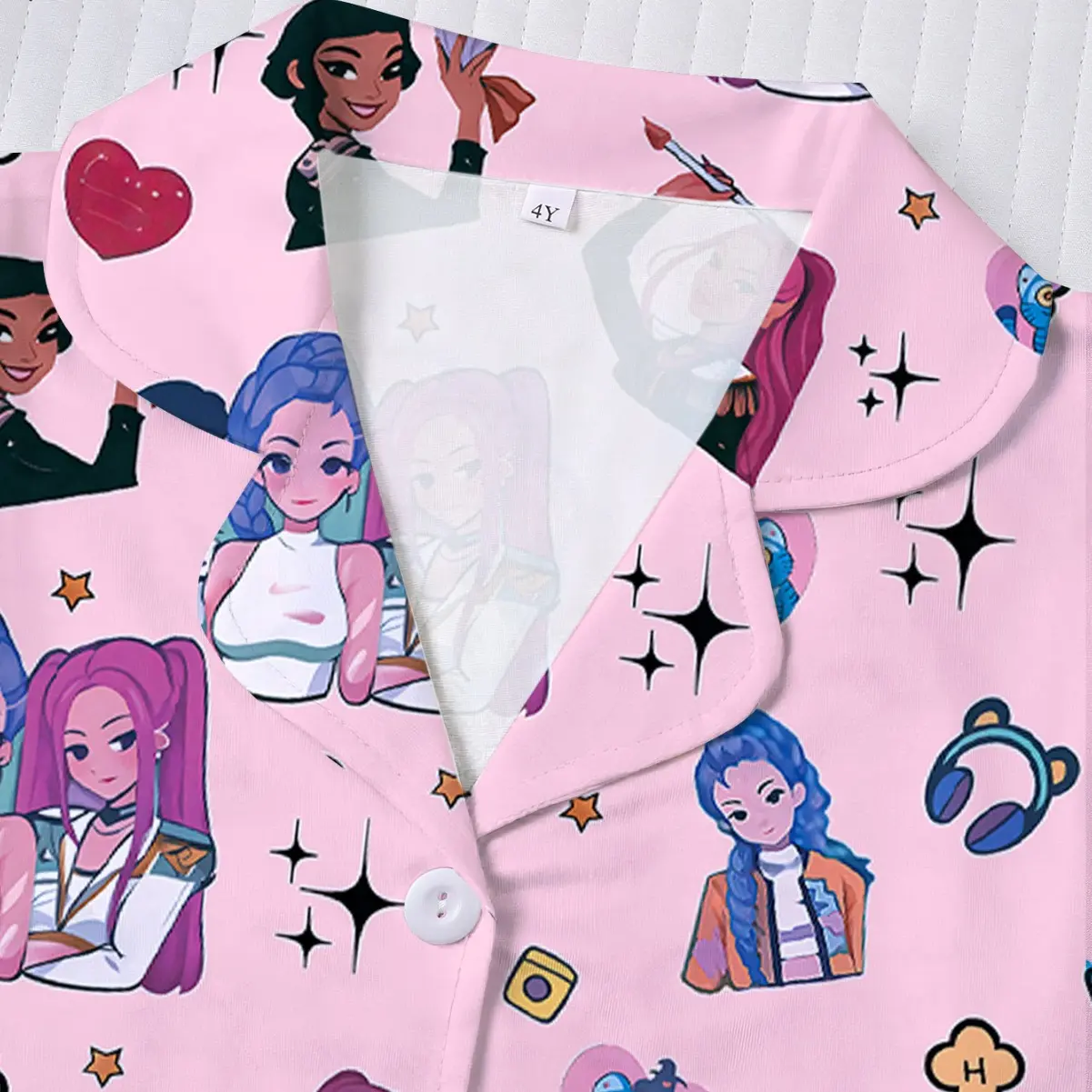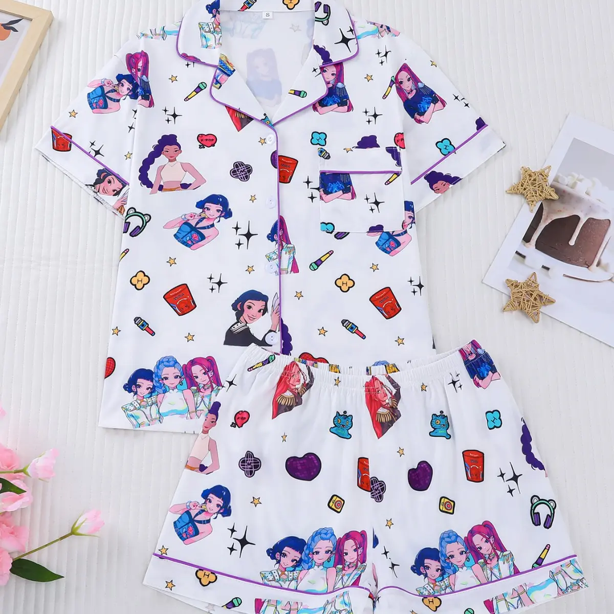 Girls Short Sleeve and Short Pajama Anime Girl Print Lapel Cardigan Loungewear 2pcs Kids Homewear Bubble Crinkle Fabric Soft Skin friendly