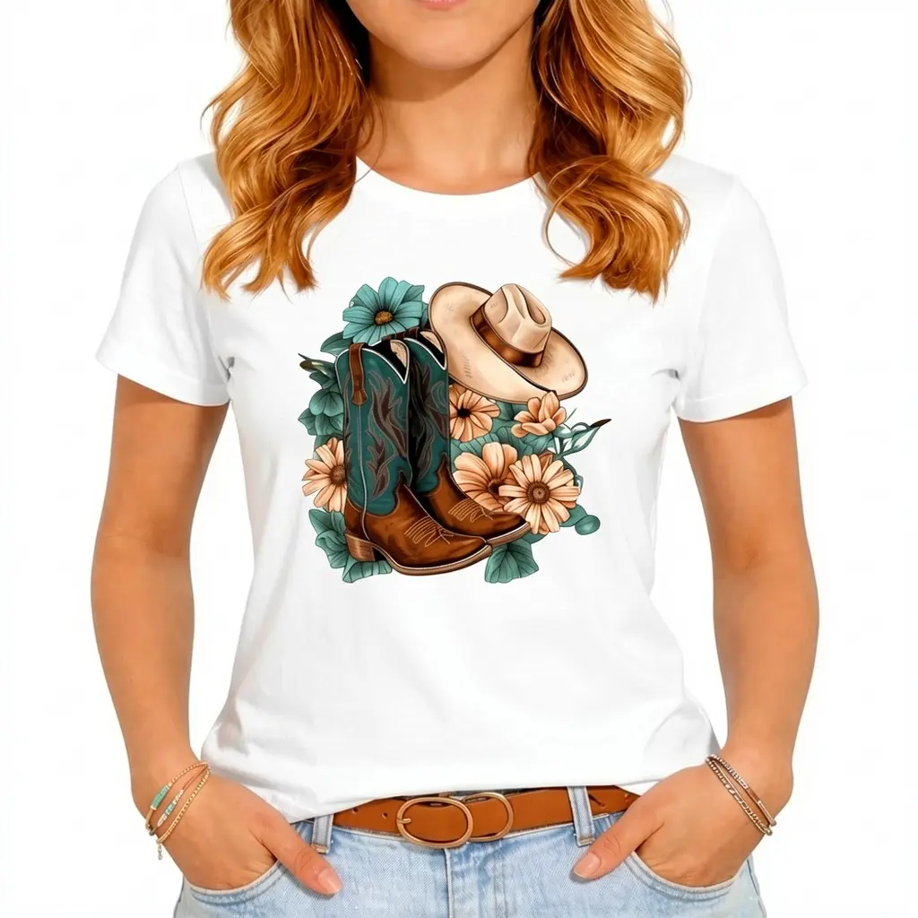 Western Cowboy Boots & Hat Floral Design T-Shirt Women's Graphic Tee Soft Comfortable Crew Neck Casual Unisex Apparel Bottom Tshirt Cotton Womenswear shirts women Fit Top Streetwear Summer graphic tees Breathable Customized Vintage