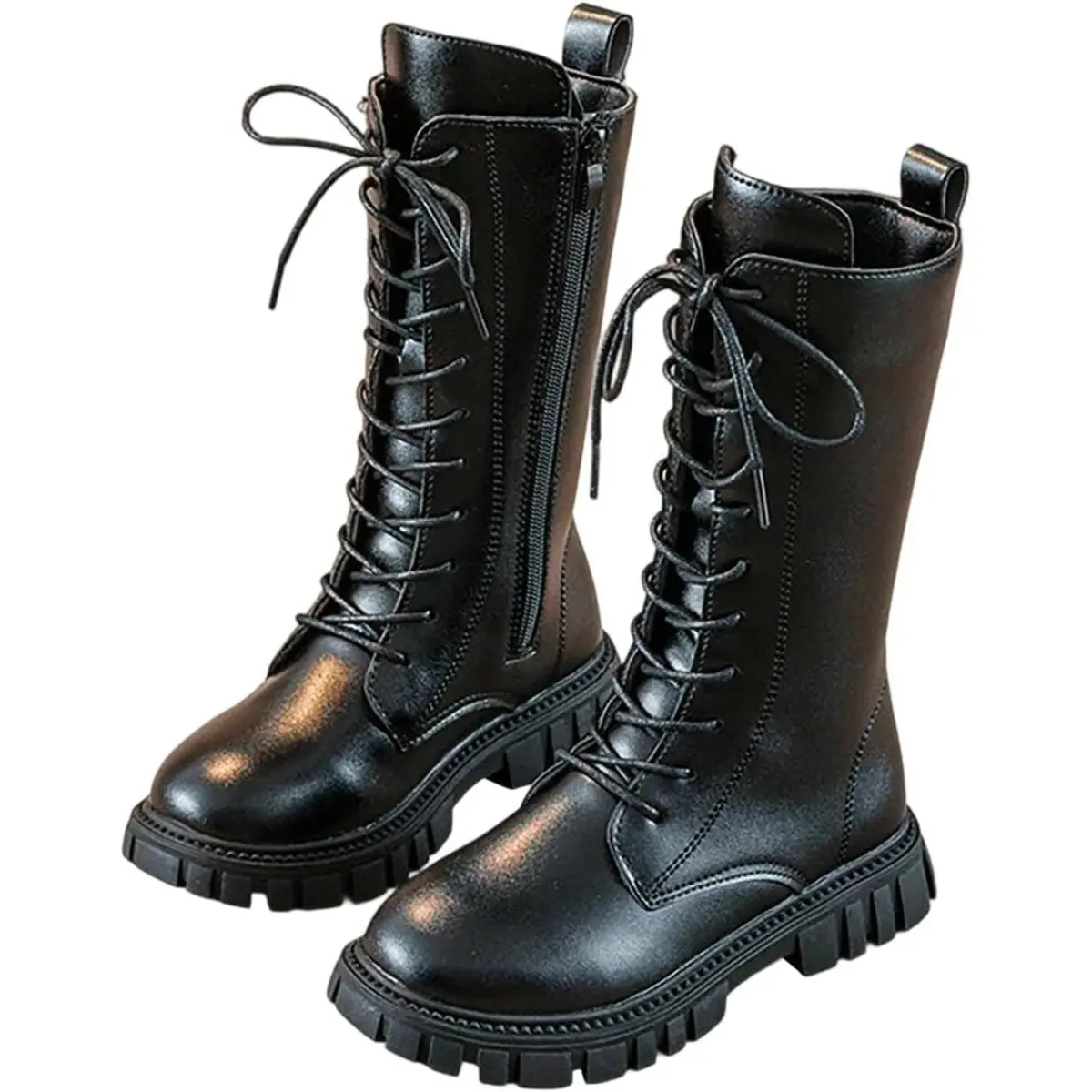 Stylish Multi-Style Design: These girls’ boots combine riding, combat, punk, and goth aesthetics, featuring a mid-calf length that adds a fashionable touch.Crafted with PU leather, they present a sleek look suitable for daily wear and style-conscious occasions.
