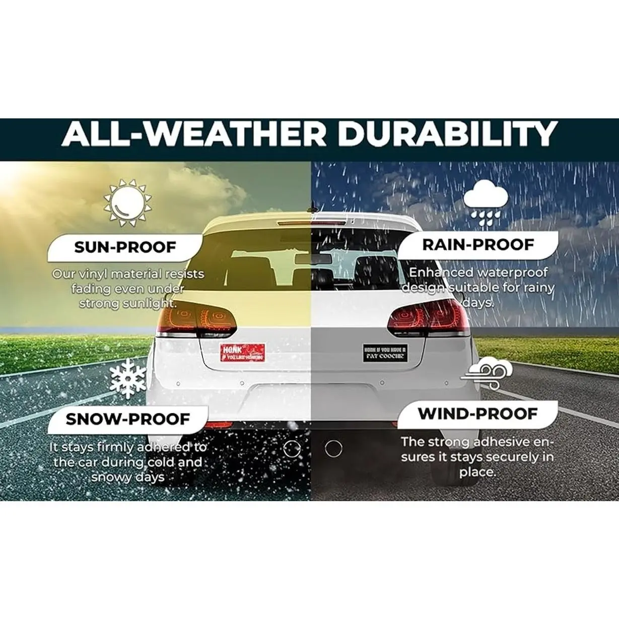 - Material: Premium water-resistant vinyl, Waterproof sticky adhesive, Weather resistant. All vinyl stickers feature a premium UV Resistant coating to protect them from sunlight and exposure to harsh weather.