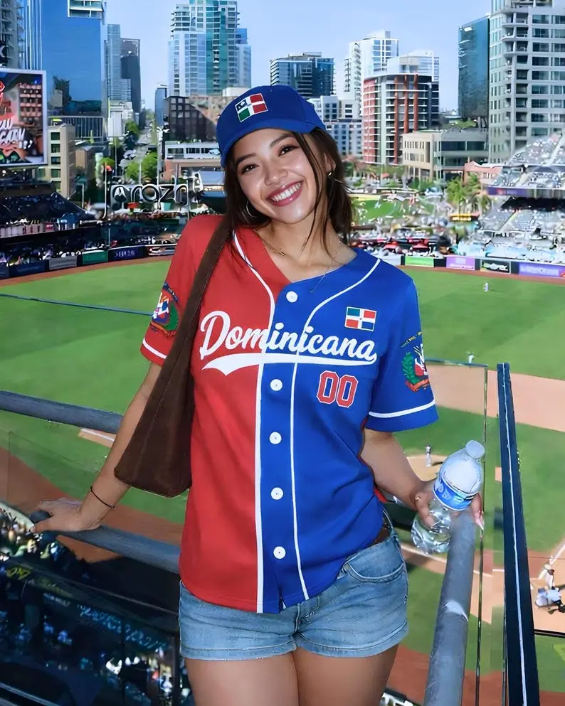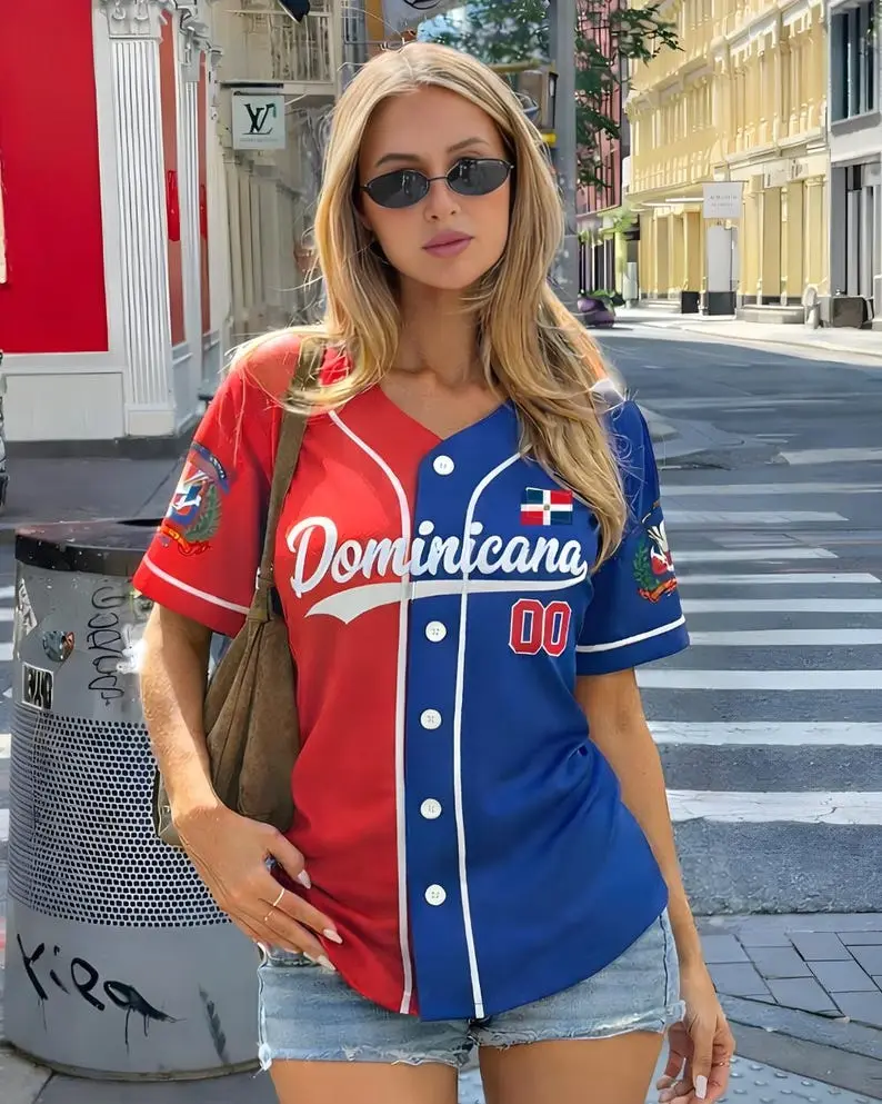 Show your Dominican pride with this stylish Dominican Baseball Jersey. Designed with a modern cropped fit and sporty baseball style, it's perfect for game days, concerts, or everyday wear. A great Dominican Republic baseball gift for fans who love bold style and cultural pride