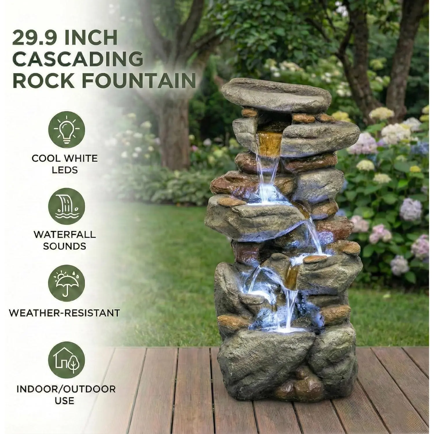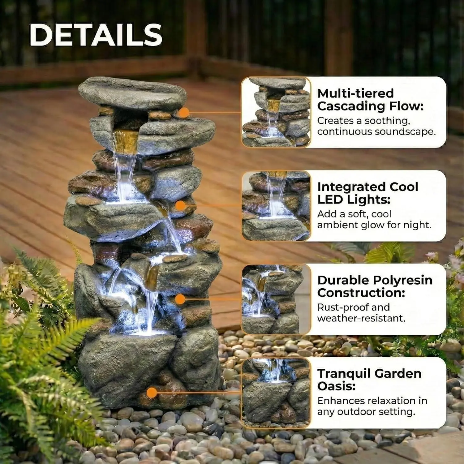 Relaxing Water Flow: Enjoy the soothing water flow as it cascades down each layer, mimicking the sound of a real waterfall and adding a tranquil ambiance to your outdoor environment. The six white lights on the rockery outdoor waterfall fountain cast a soft and cozy glow, enhancing the overall atmosphere with a radiant charm.
