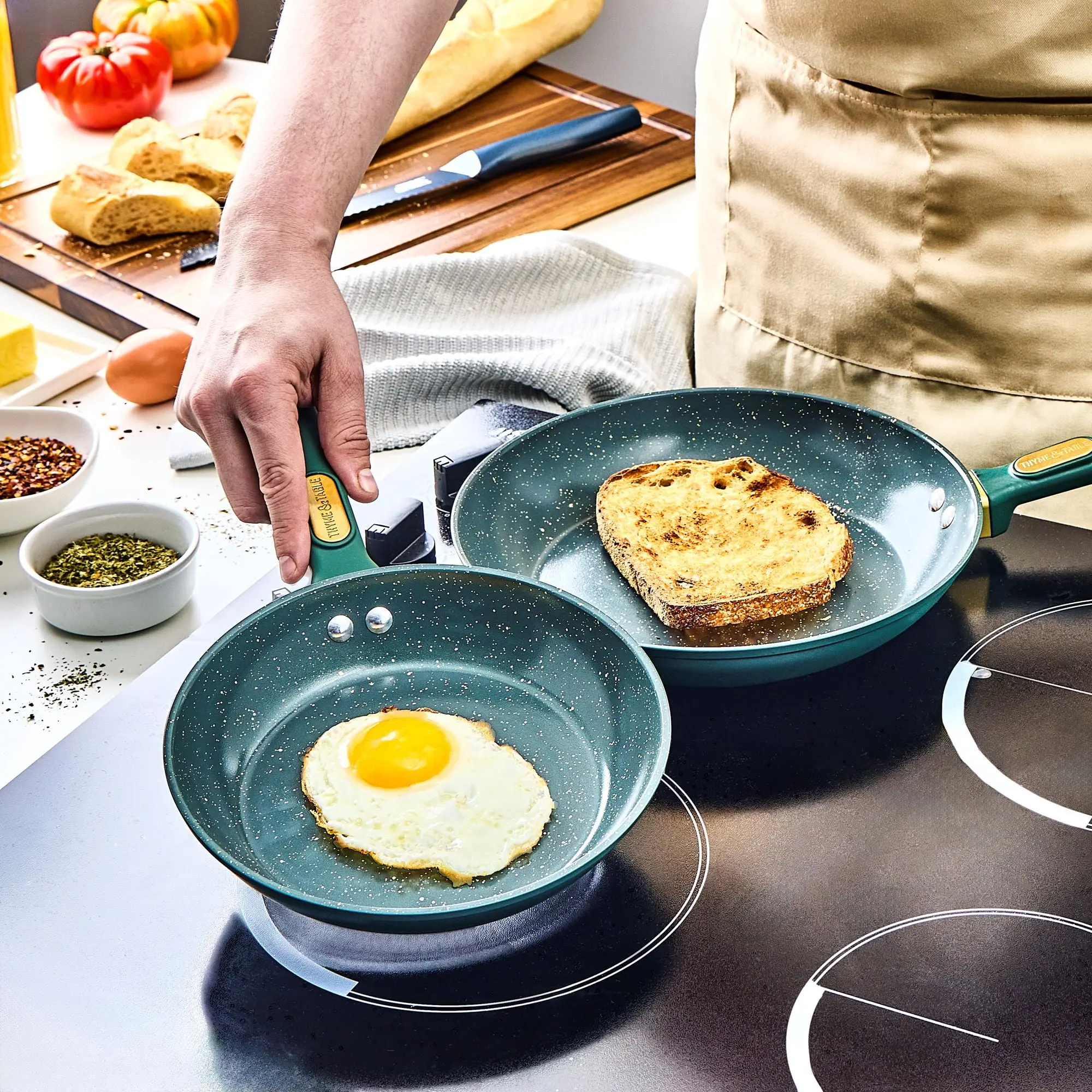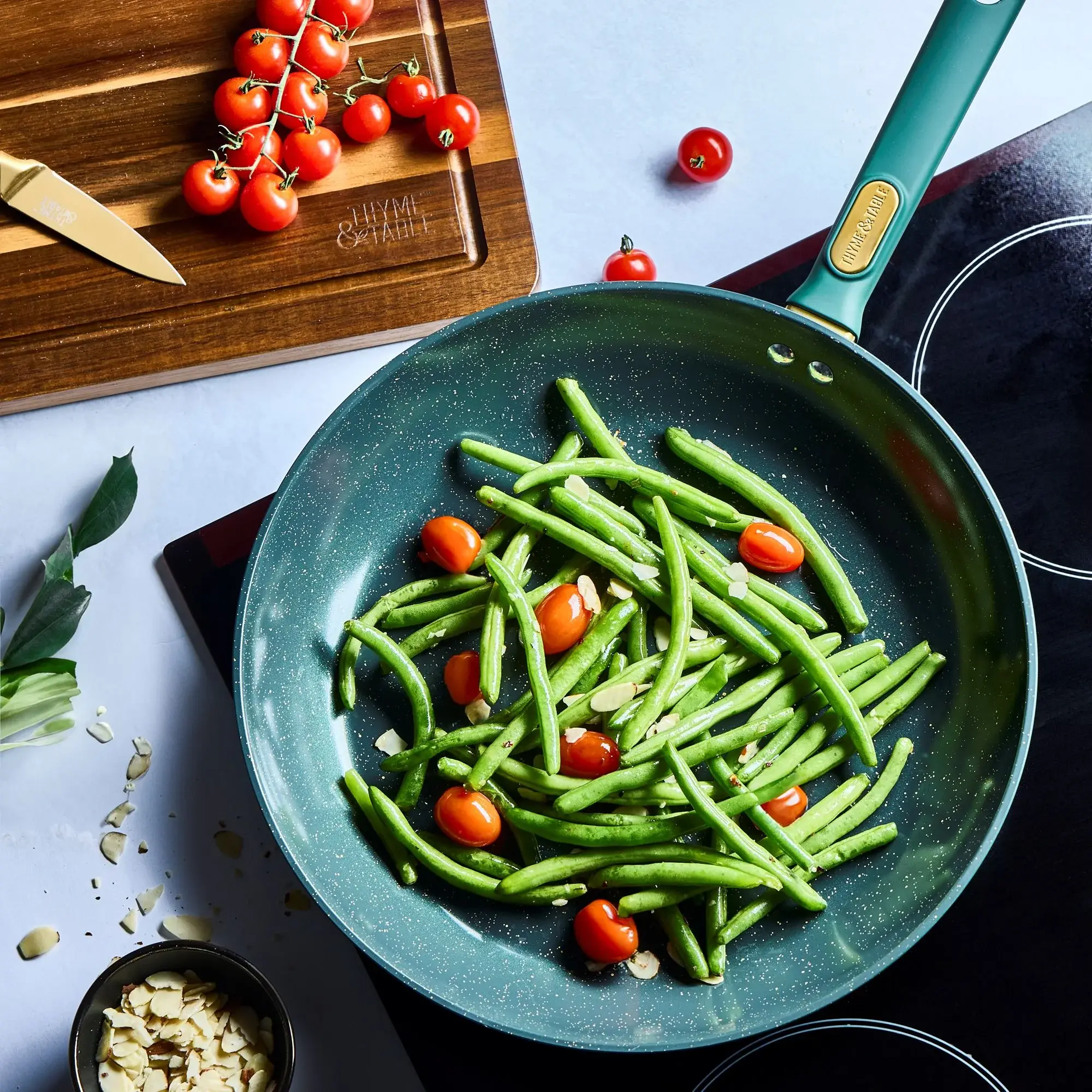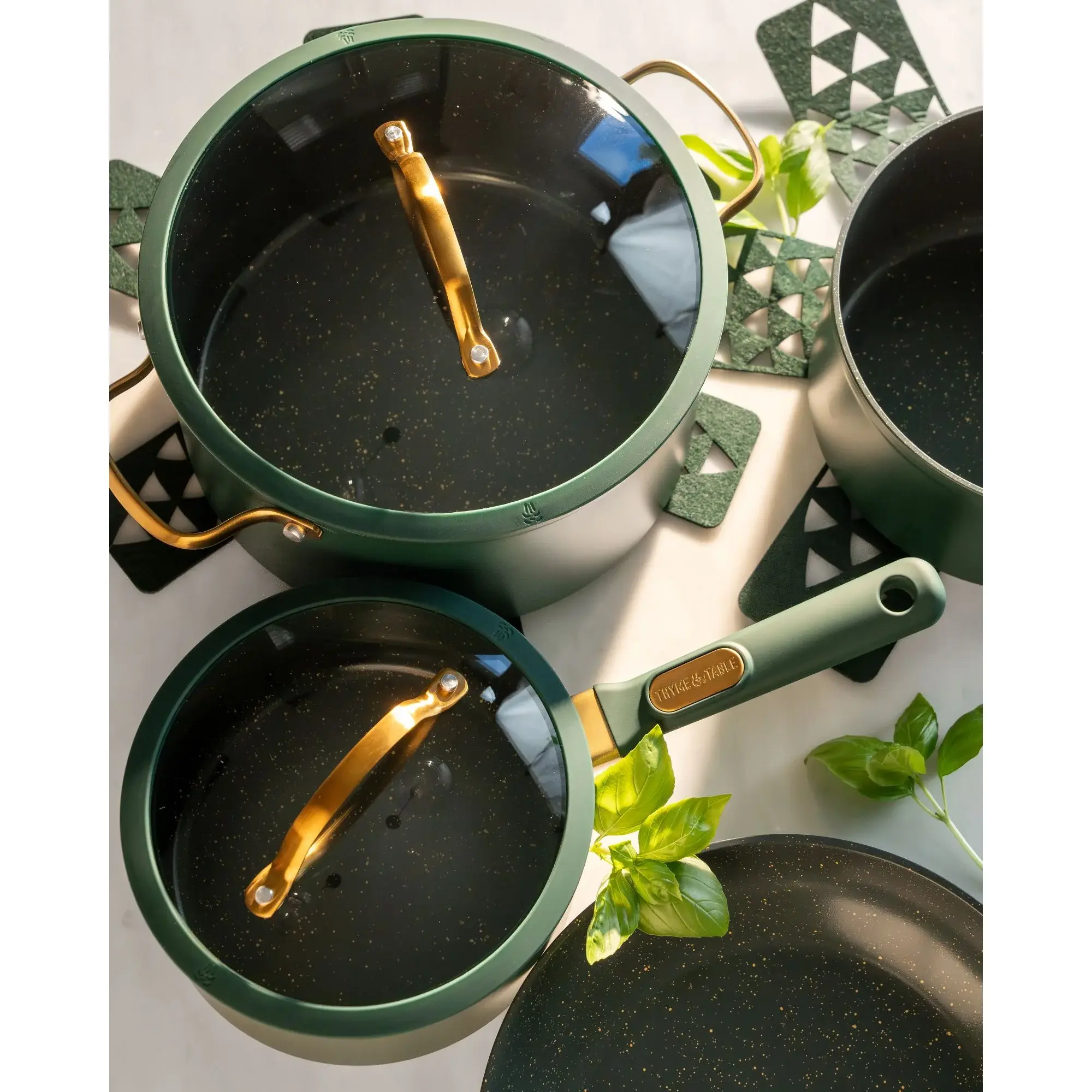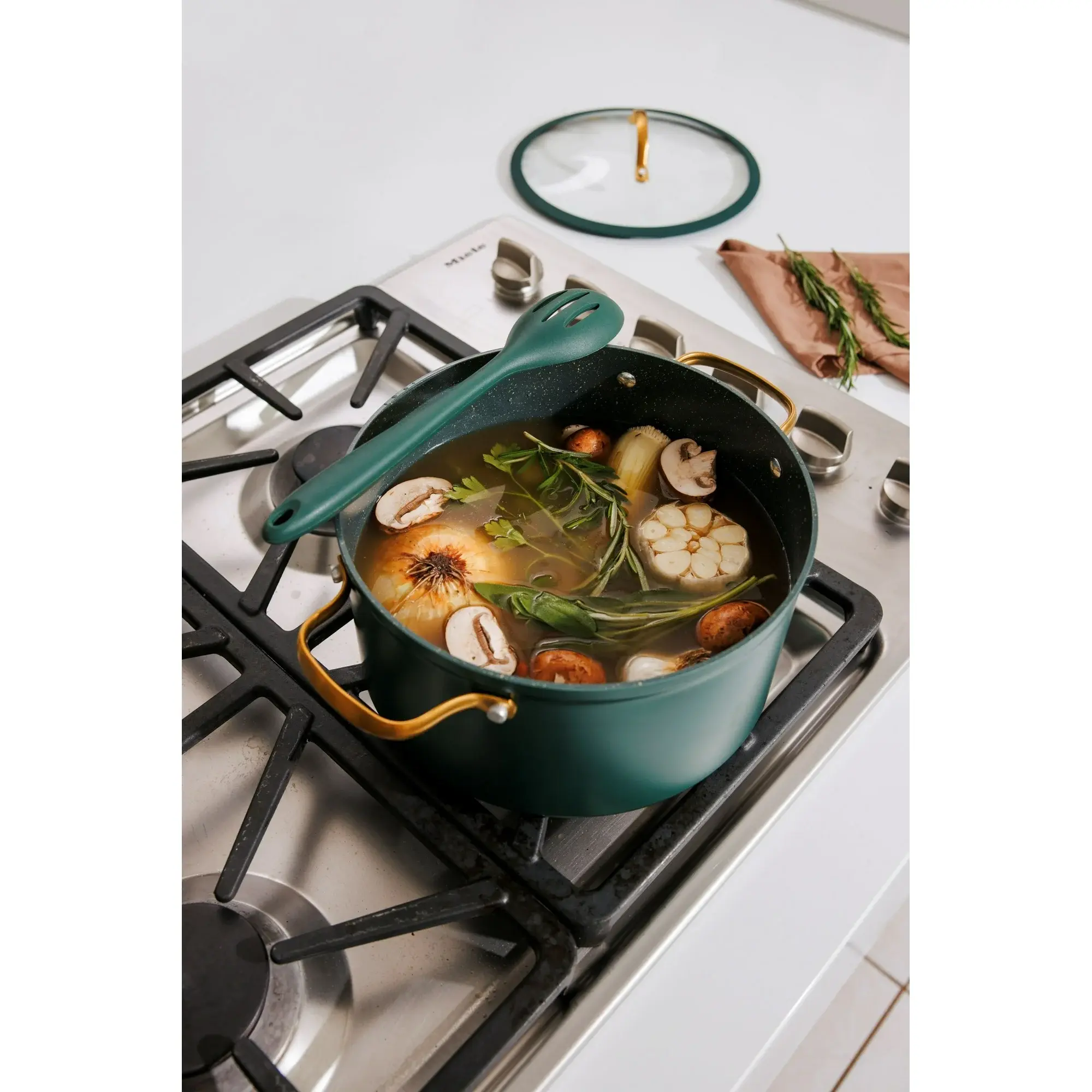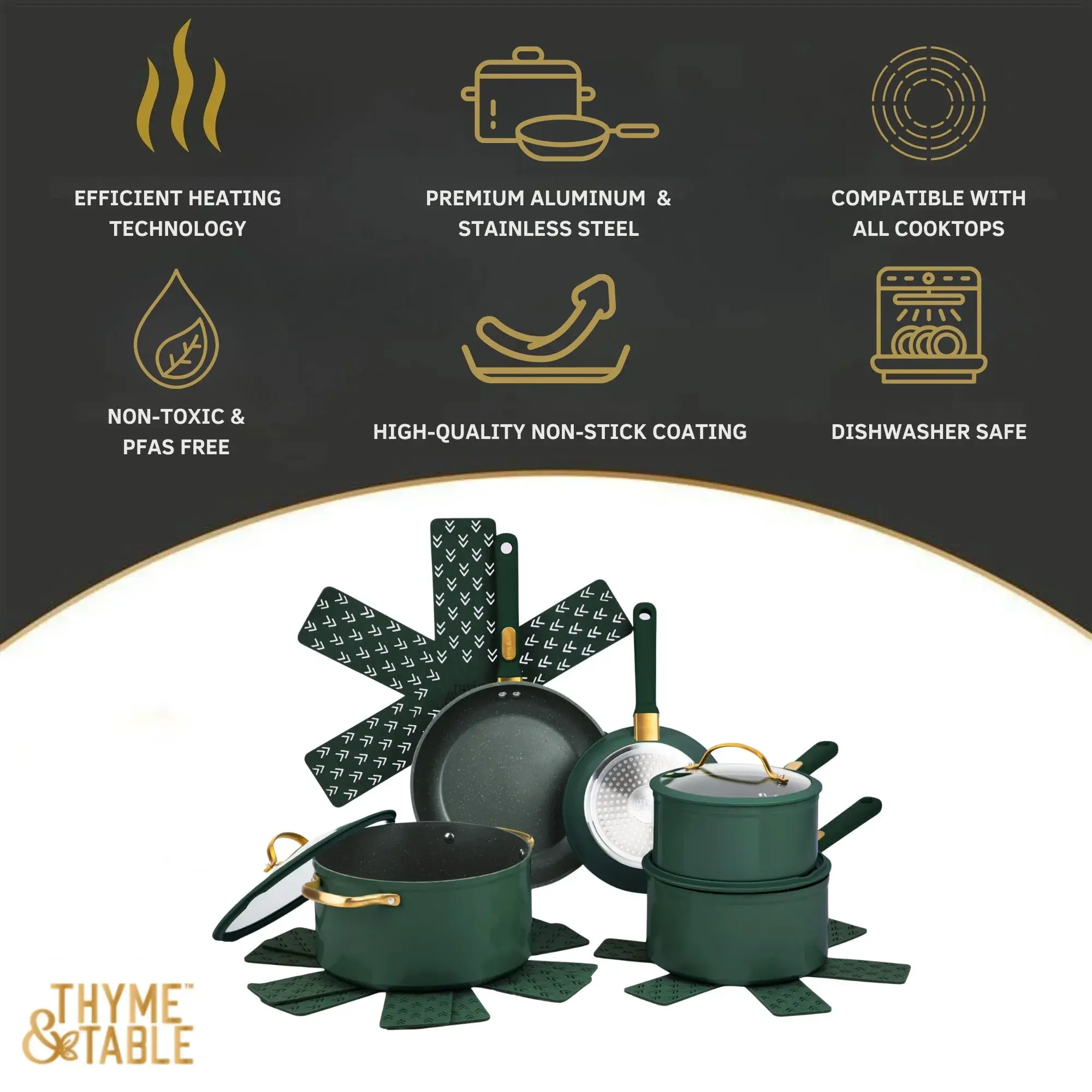 Introducing the Thyme & Table Ceramic Nonstick & Non-Toxic 12-Piece Granite Cookware Set - Hunter Green from our Essential line, designed to offer excellent value for cost-conscious customers. Enjoy high-quality cookware at an affordable price, making every meal preparation a delightful experience. Included with this set is and 8- inch and 10”- inch Fry Pan perfect for searing or sautéing, 6QT Stock Pot with Lid ideal for stews or pastas, a 3.5QT and 2.5QT Saucepan with Lids which provide different capacities for every dish, and 4 Cookware Protectors designed to help maintain the pristine condition of your cookware set over time.