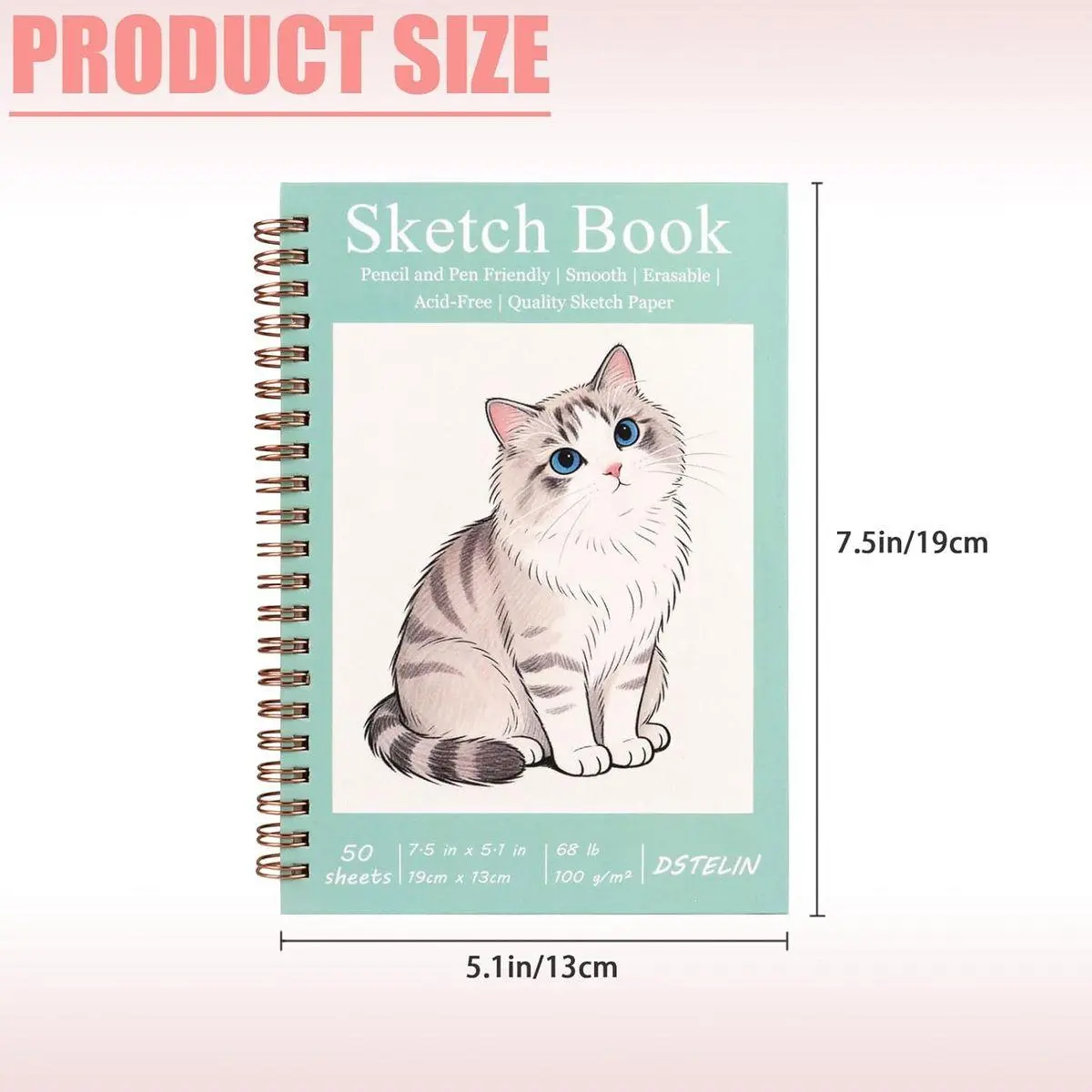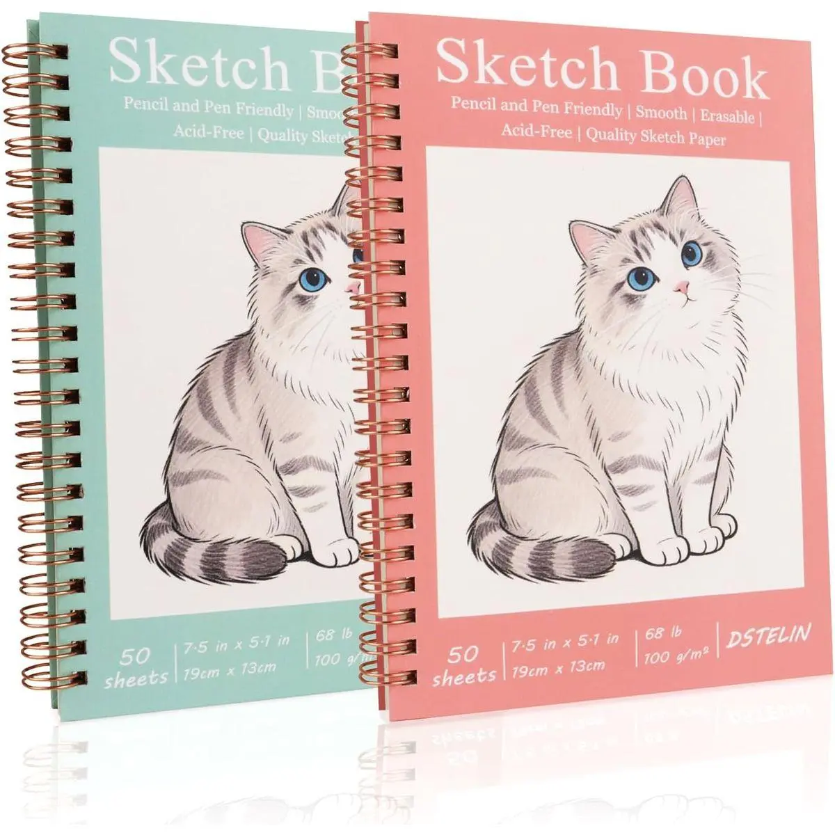 DSTELIN 2-Pack Mini Sketchbooks with Ragdoll Cat Art: Spiral-bound and landscape-oriented (7.5 x 5.1 in / 19 x 13 cm), each features a lovely hand-drawn ragdoll cat illustration—one on a mint-hued hardcover and the other on a pink hardcover—adding a sweet, charming touch to your artistic endeavors.