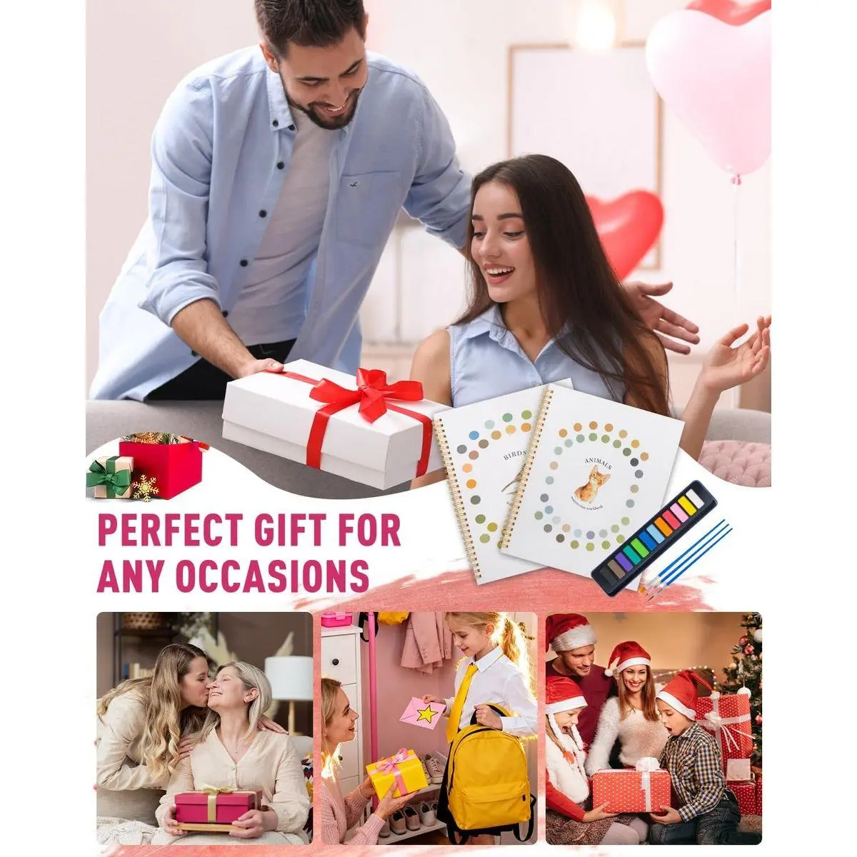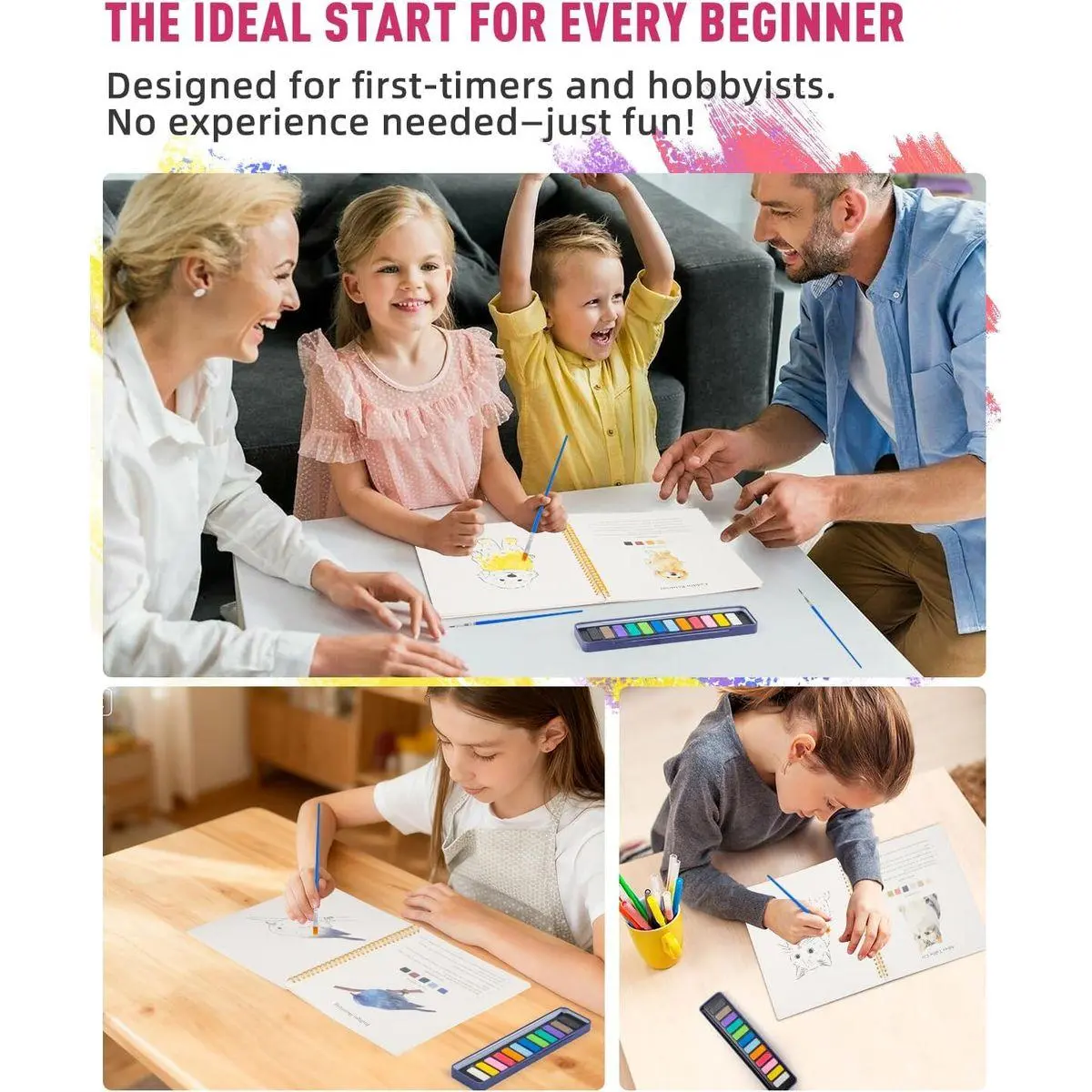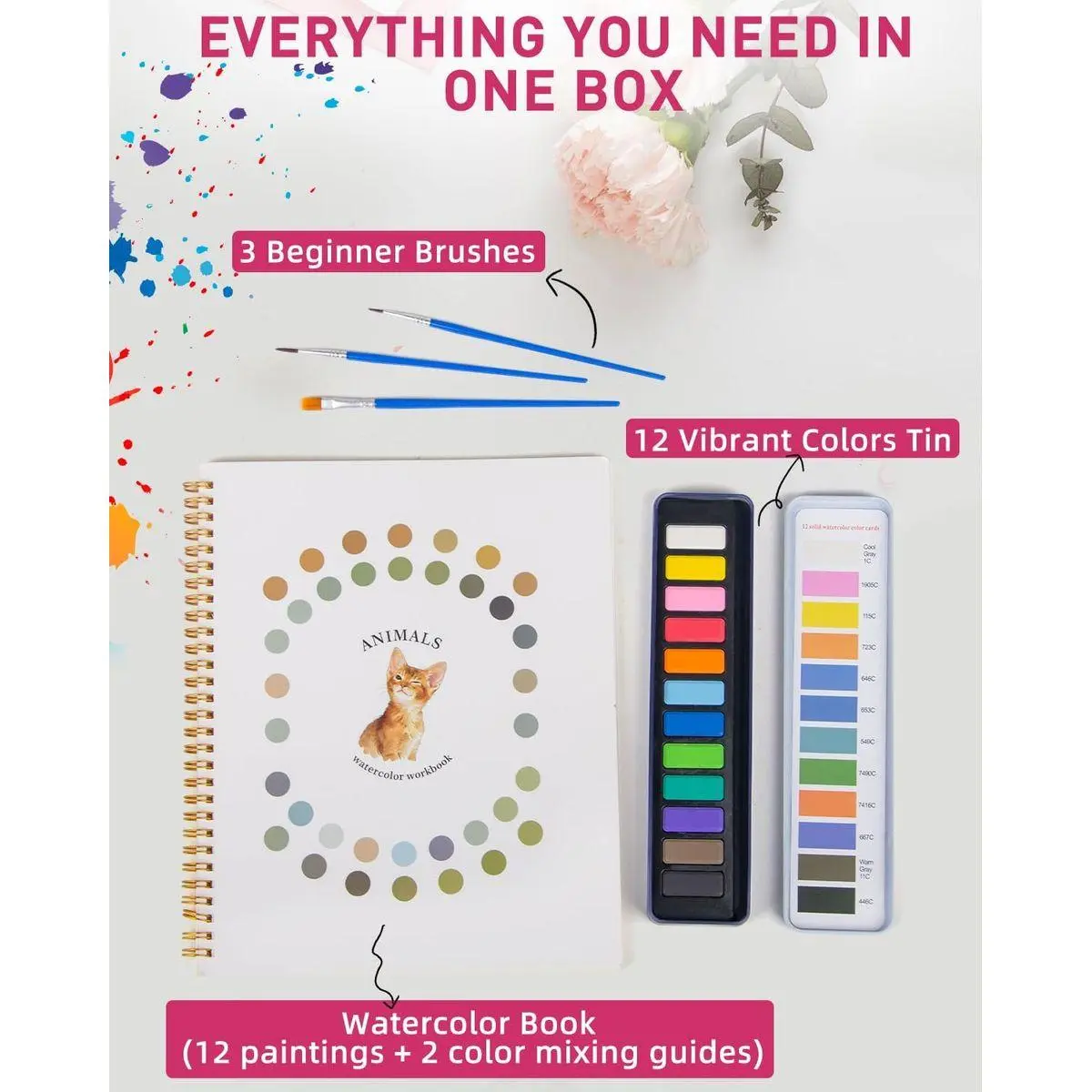 🎁 [All-in-One Watercolor Set] Everything you need to start painting right away: ✅ 2 Pre-printed Watercolor Book (12 different paintings with color guides) ✅ 3 Beginner-Friendly Brushes (ideal for first-timers; explore our store for professional brush sets) ✅ 1 Rust-proof 12-Color Paint Tin (upgrade available with our 100-color professional palette)