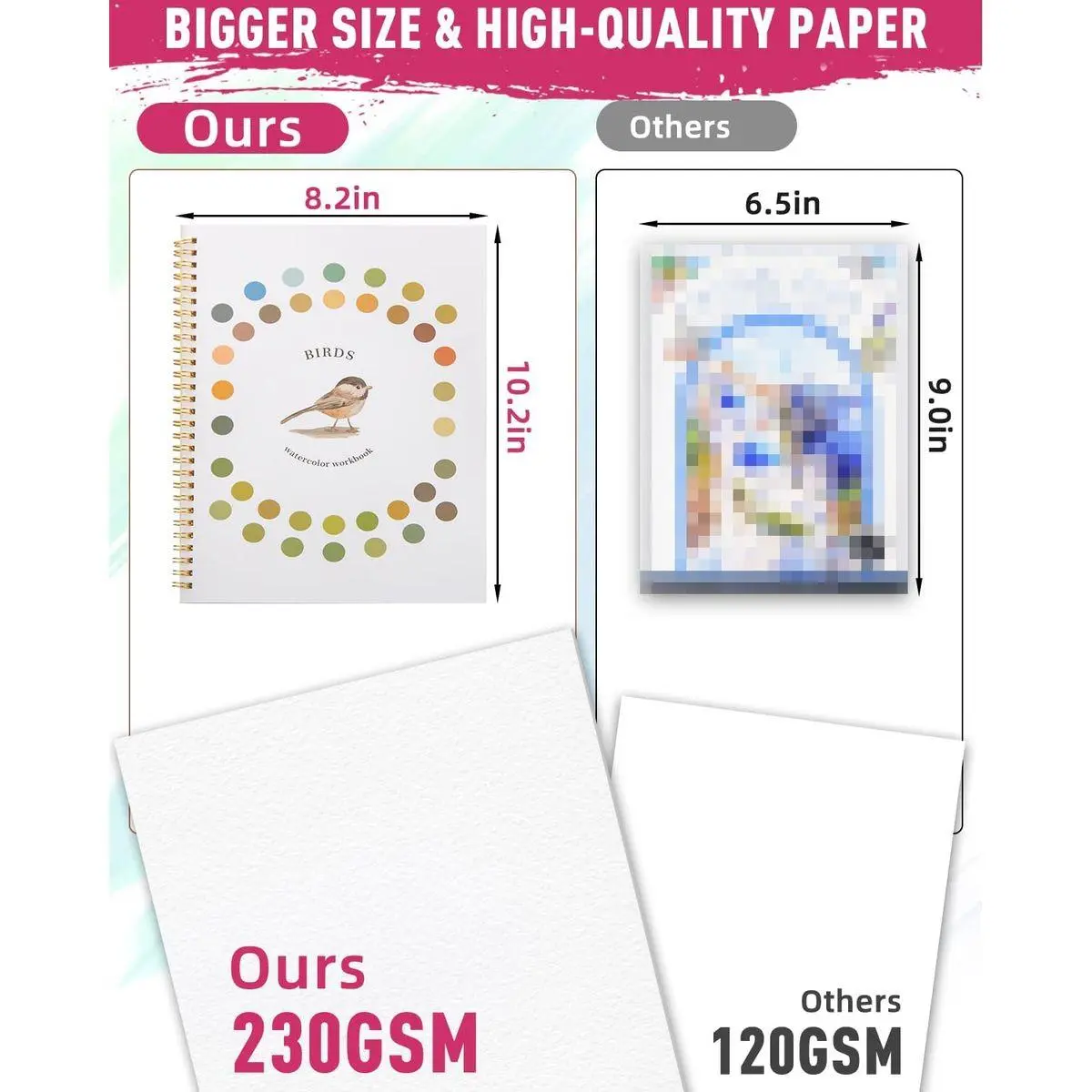 📄 [Thick, High-Quality Paper] No more bleed-through! Our paper is 230 GSM thick, much heavier than typical sketchbook paper. Paint confidently without worrying about colors seeping through to the next page.