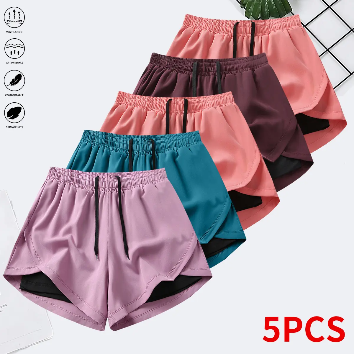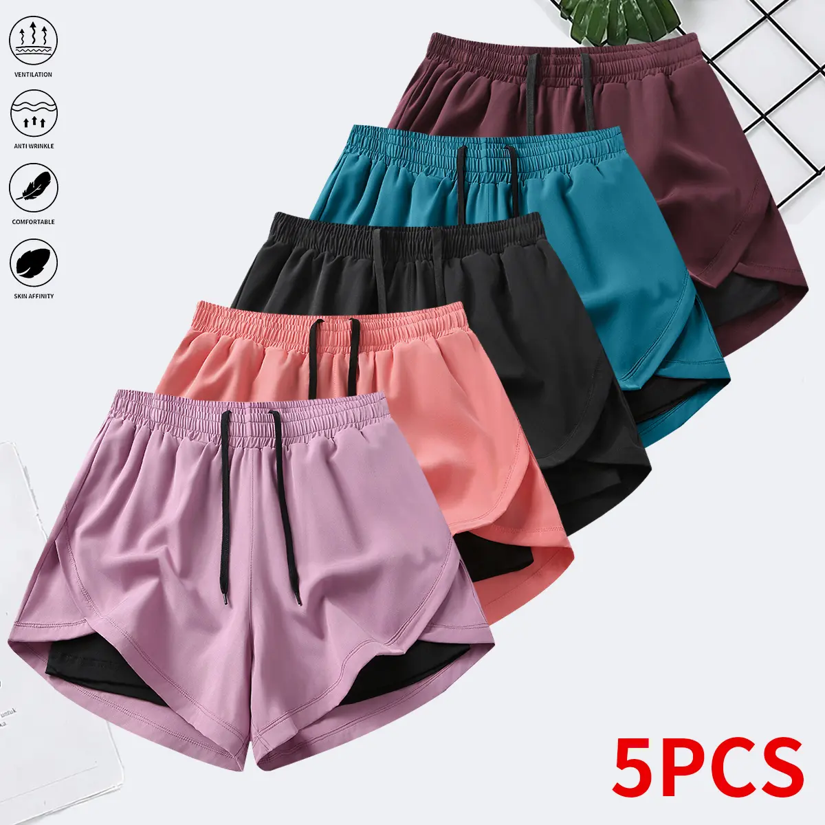 Women’s summer shorts: double-layer faux two-piece mid-length knit pants made from polyester–spandex fabric; breathable, quick-drying compression base layer shorts with elastic drawstring waist; suitable for fitness training, casual sports, and running.