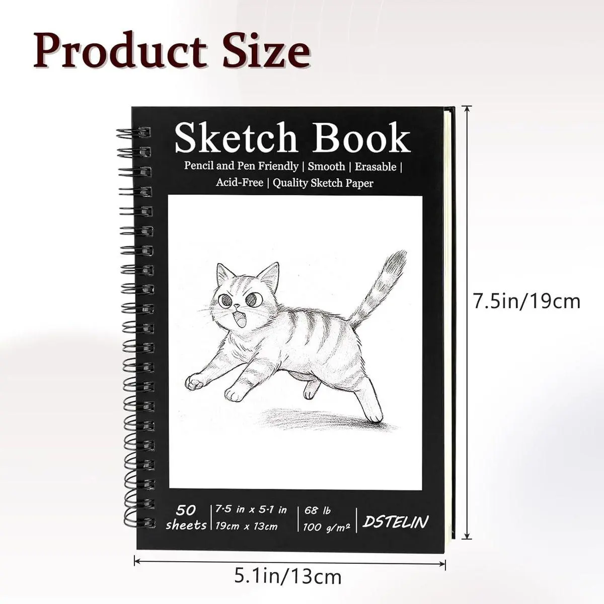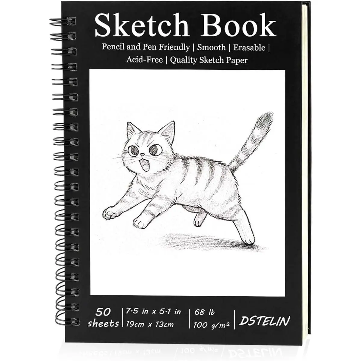 DSTELIN Single Sketchbook: Spiral-bound and landscape-oriented (7.5 x 5.1 in / 19 x 13 cm), it features a sleek black hardcover with adorable hand-drawn cat motifs