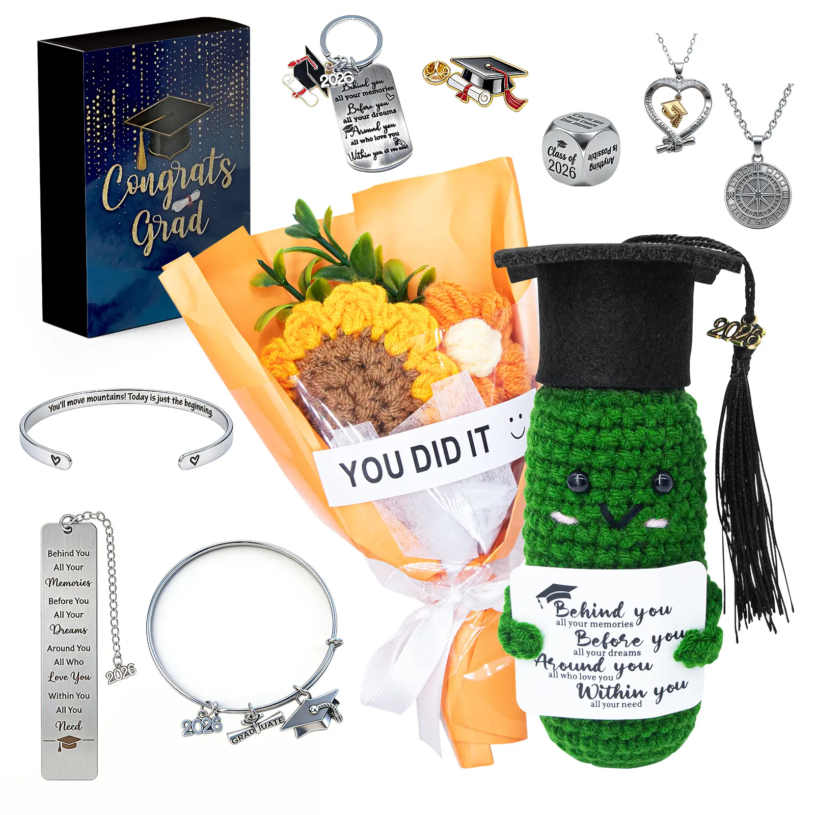 Each box comes packed with 10 unique graduation-themed gifts: a super cute Graduation Pickle Doll, a handy Graduation Decider Dice, a meaningful Much Compass Necklace, a stylish Graduation Necklace, a cool Graduation Keychain, a sleek Graduation Bracelet, a keepsake Graduation Bookmark, a charming Knitted Handmade Bouquet, an inspirational Bracelet with Graduation Wishes, and a sparkling Graduation Brooch. Every piece is thoughtfully designed to celebrate their big achievement and inspire what’s next.