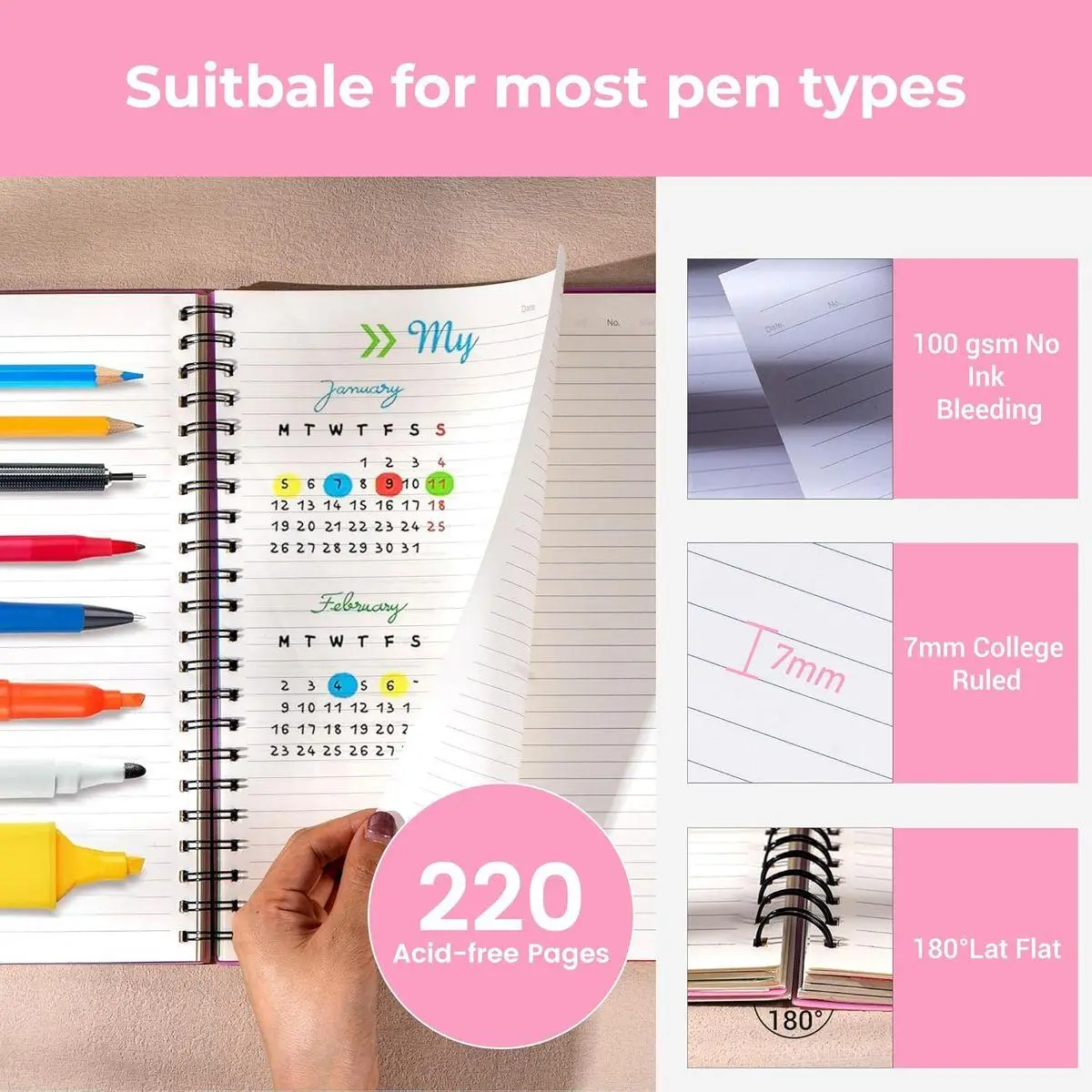【Double Spiral Binding Notebook】: The strong double spiral binding is less likely to fall apart than wire binding, ensuring that the inner pages are organized. The college ruled notebook with tabs can lay flat to take notes, so no one needs to worry whether they are left-handed or right-handed writers. For note taking convenience, you can also flip the pink spiral notebook 360°.