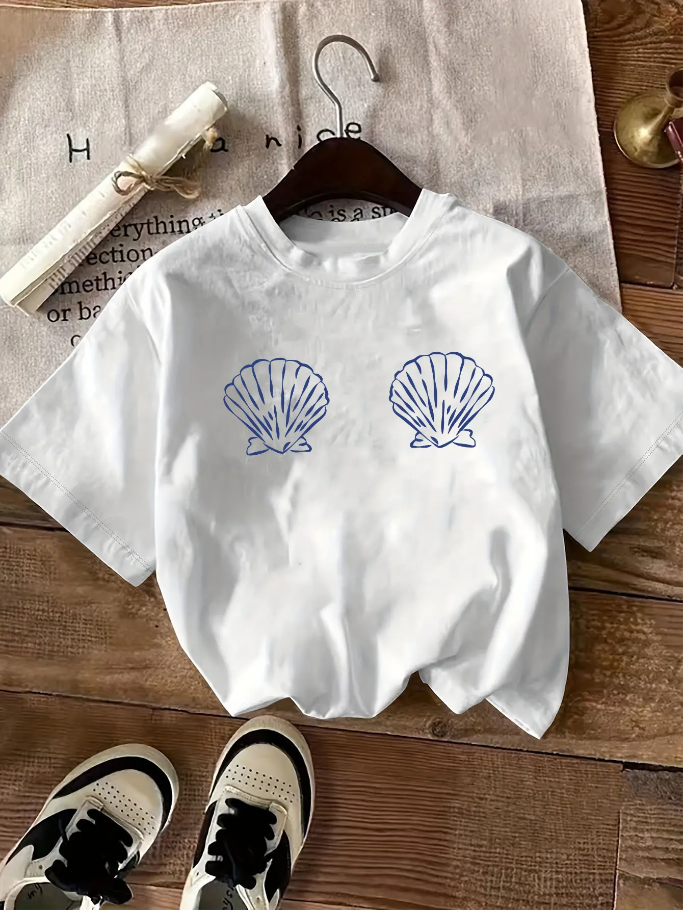 Women'S Tropical Shell Print Casual T-Shirt - High-Stretch Round Neck Short-Sleeve Top, Machine Washable in White And Blue for Summer Beach Wear, Comfortable Fit for All Seasons, Breathable Fabric, Minimalist Design