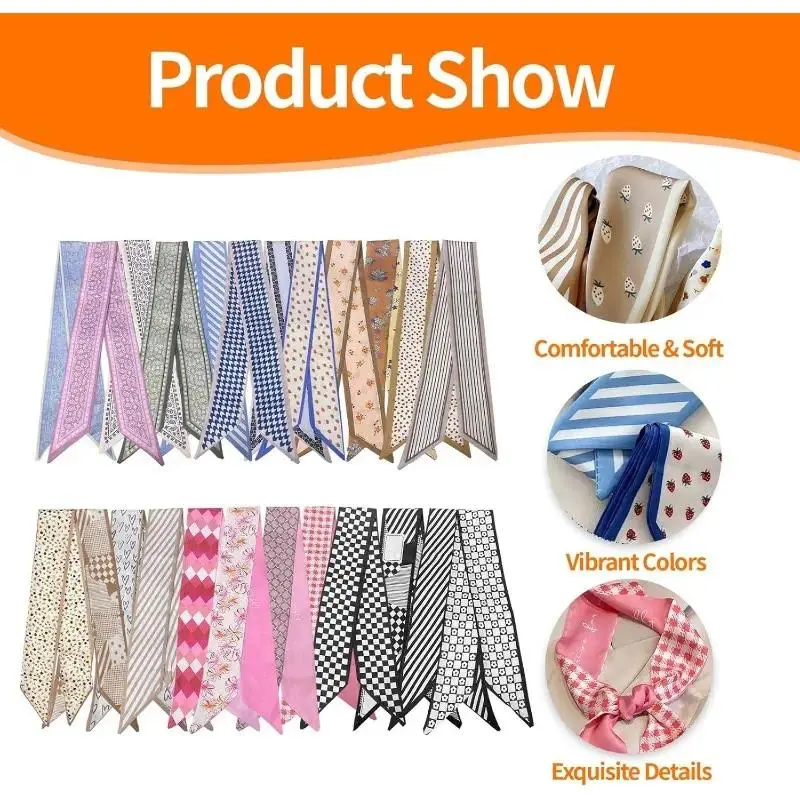 Luxurious Silk-Like Feel – Crafted from premium simulated silk, these scarves have a beautifully smooth and gentle drape. The lightweight fabric feels comfortable against the skin, making them perfect for all-day wear as neck or hair accessories. Endless Styling Possibilities – This set is your ultimate styling toolkit. Effortlessly transform any look by wearing them as elegant neck scarves, chic headbands, stylish hair ties, or even as decorative accents for your favorite handbags. Perfect Versatile Dimensions – Each scarf measures 38.6 x 2.7 inches (98 x 6.8 cm), the ideal size for tying around your neck, weaving into hairstyles, or adorning bag handles to instantly refresh your purse or tote with a pop of color and pattern. Vibrant & Easy-Care Colors – Featuring fade-resistant dyes that maintain their rich, vibrant colors through many wears and washes. Whether styled in your hair or on your bag, these scarves are designed to stay looking fresh and new. Travel-Friendly & Ready to Gift – Each scarf arrives neatly packaged individually, making organization and storage a breeze. The compact set is perfect for keeping in your purse or suitcase, ready to elevate your style anywhere—and makes a wonderful gift for any fashion-loving friend.