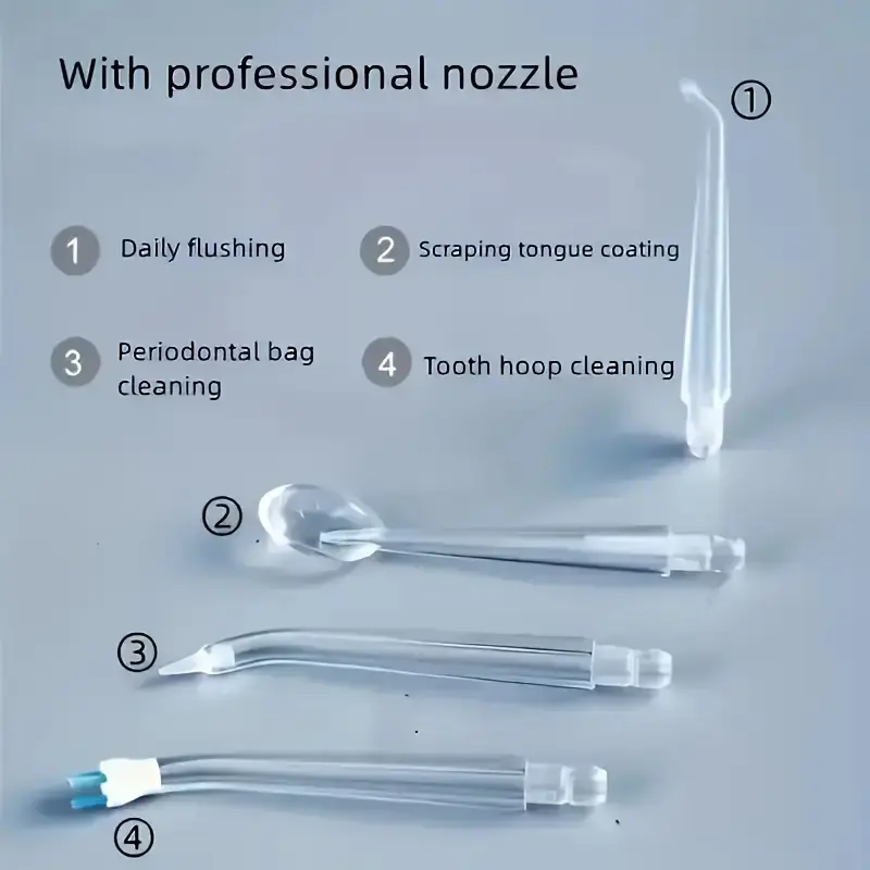 【Interdental nozzles】: Includes four specialized interdental nozzles designed for effectively reaching and cleaning between teeth.