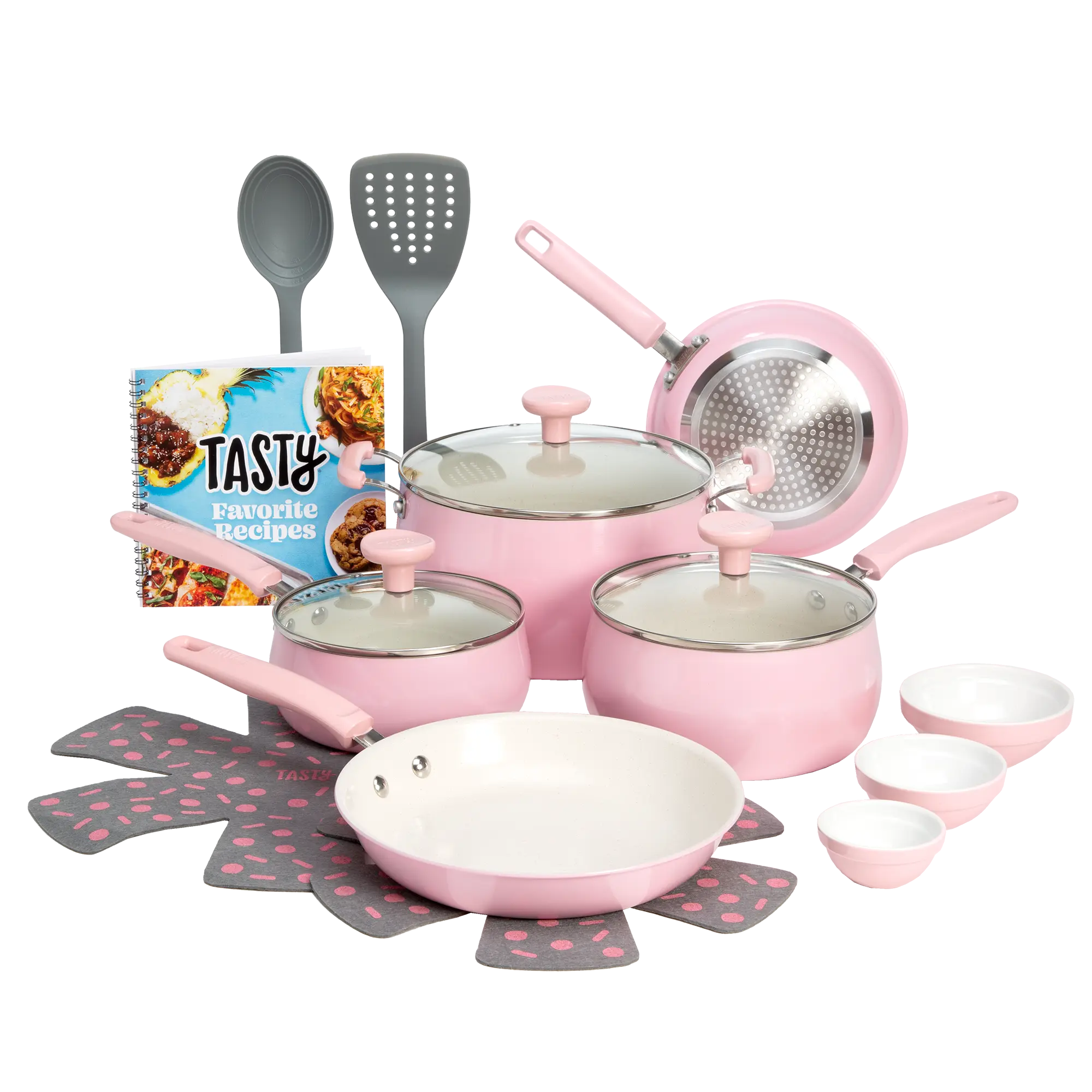 ·Includes: 8-inch fry pan, 9.5-inch fry pan, 1.5-quart saucepan with glass lid, 2.5-quart saucepan with glass lid, 5-quart dutch oven with glass lid, 2-piece cookware protectors (11.5 inch and 13.5 inch), solid spoon, slotted turner, 3-piece ceramic prep bowls (6-ounce, 4 ounce and 2 ounce)