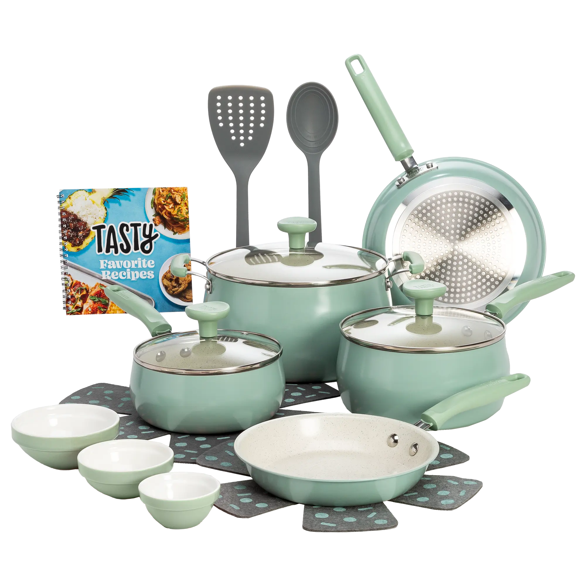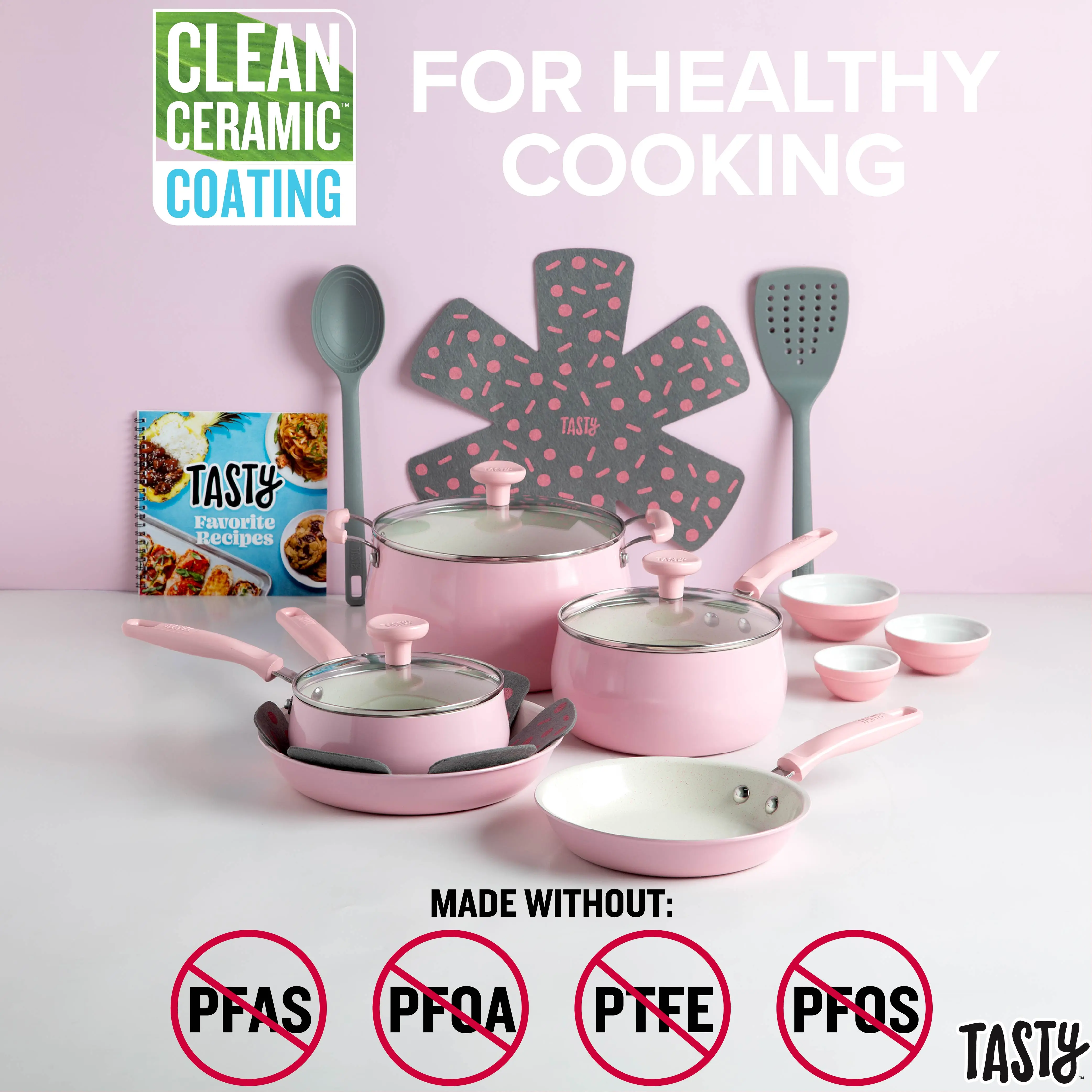 Everything you need for your kitchen in one box! Set your kitchen up for success with this Tasty Clean Ceramic non-stick 16 piece cookware set. The better, stronger, and longer-lasting reinforced Clean Ceramic non-stick coating allows food to easily slide out of the pan. When you're looking to store these pots and pans, use the included pan protectors to sandwich in between two pieces of cookware to allow for stacking and storing without scratching. The cookware also features a stainless steel induction base, making this cookware suitable for all cooking surfaces, including induction, electric, gas and glass.