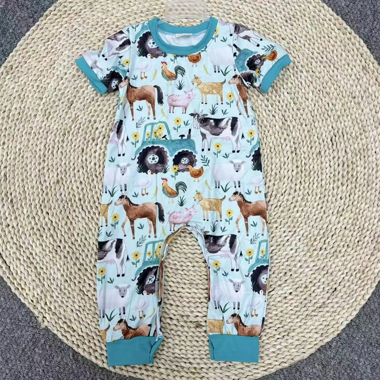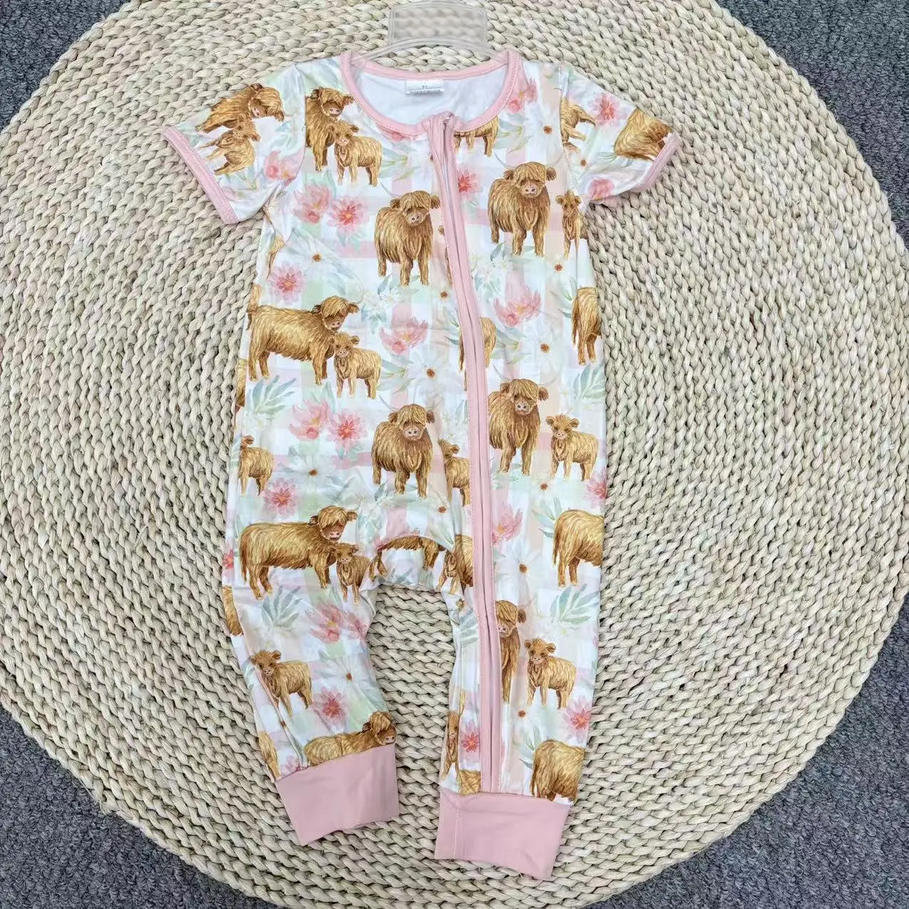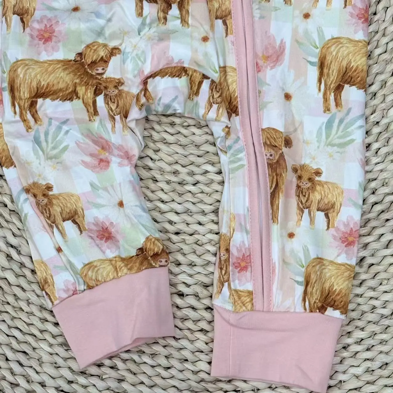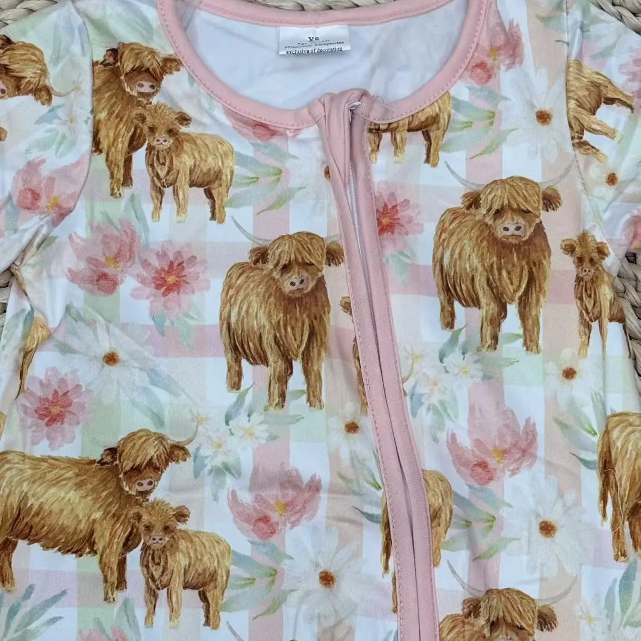 This cute romper features a playful highland cow print with beautiful pink flowers, perfect for little girls who love farm animals and boho style!