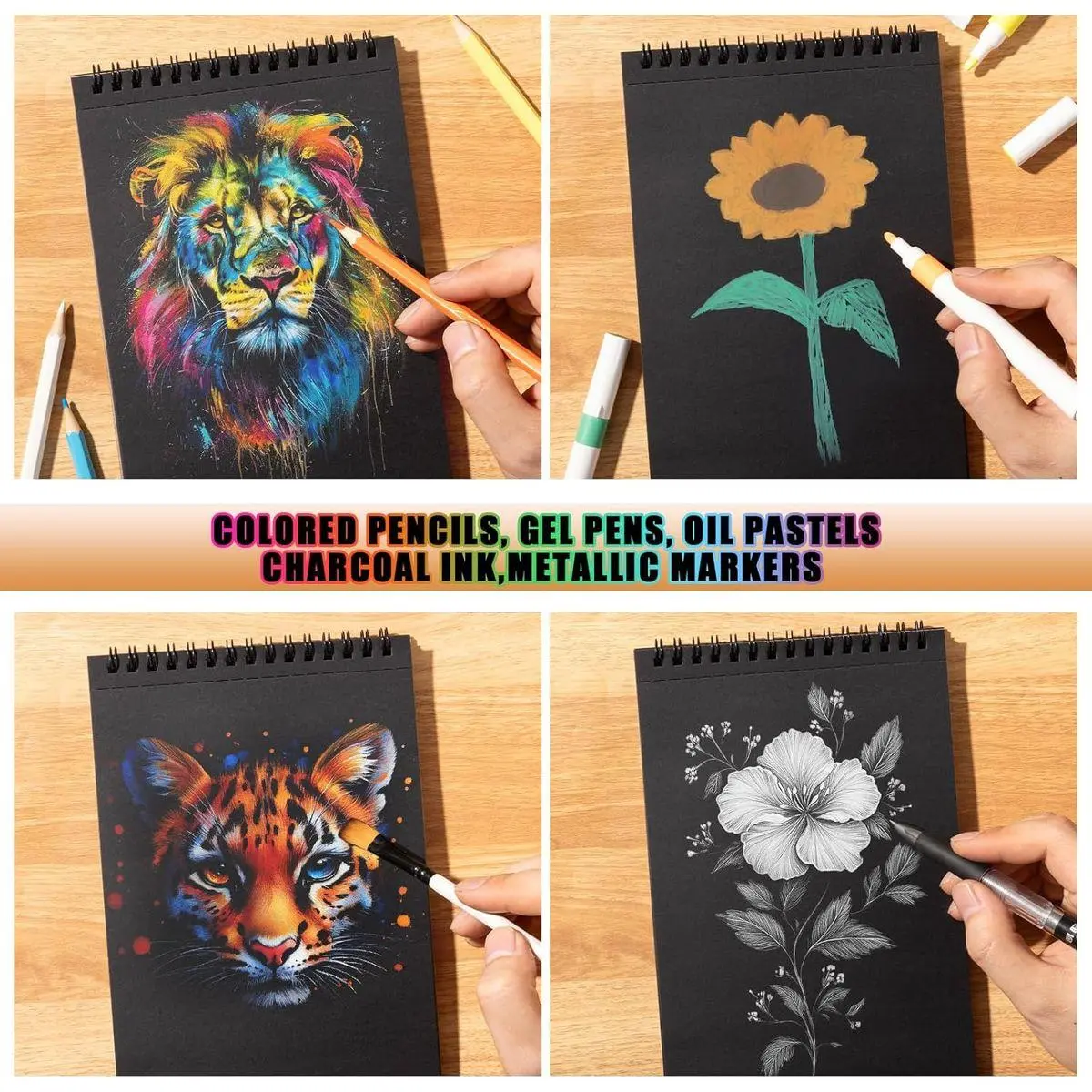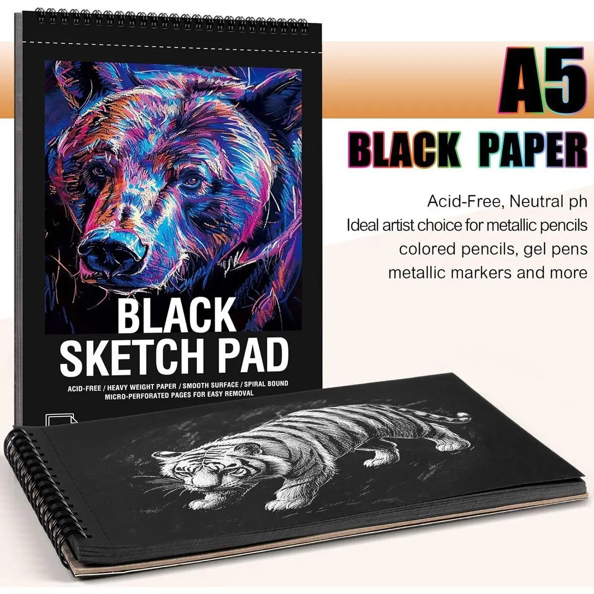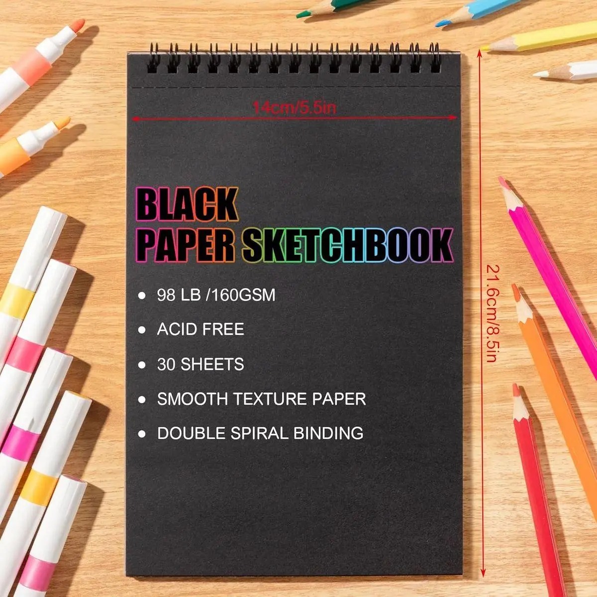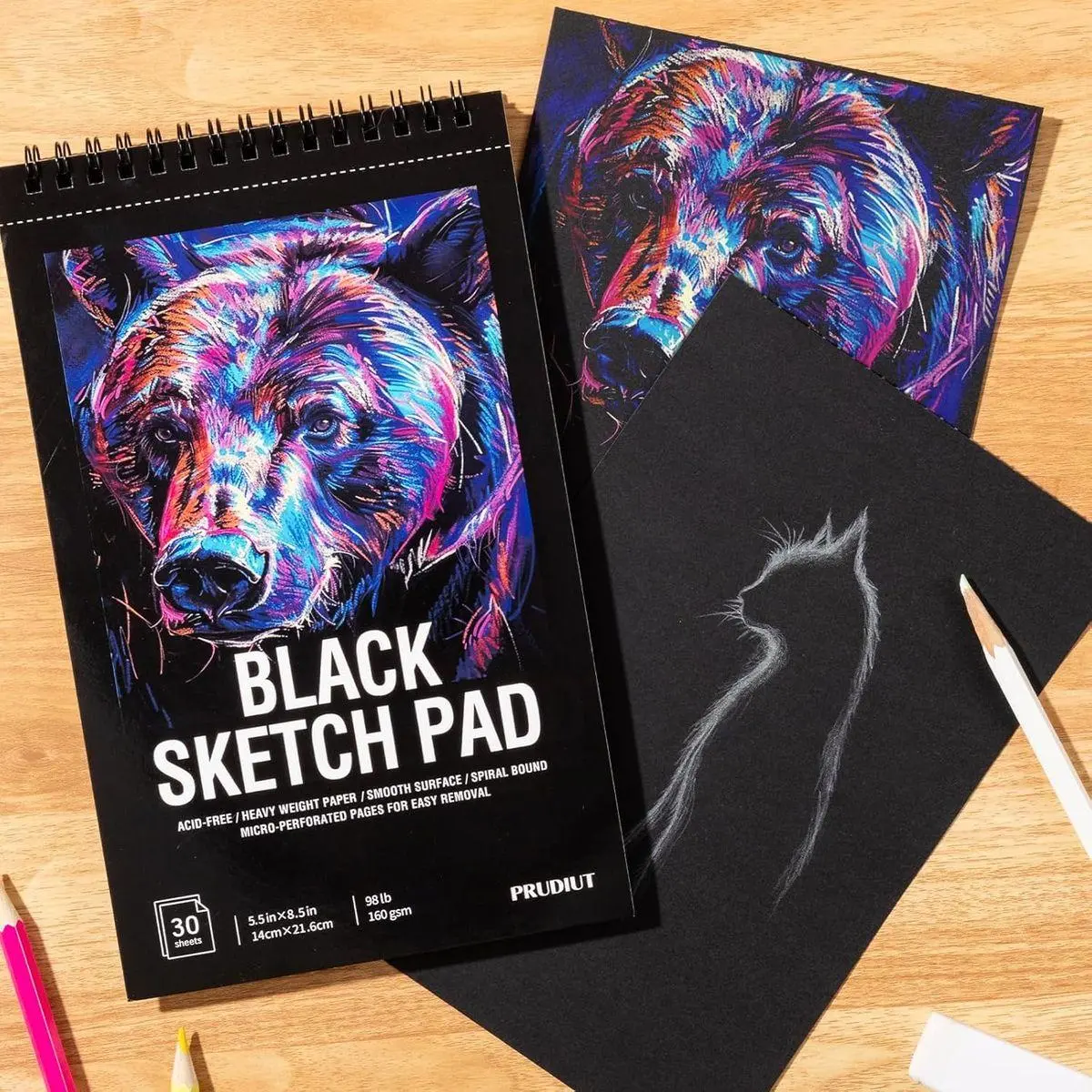 【Professional Black Paper Sketchbook】1 premium black paper sketchbook (5.5" x 8.5") with 30 sheets of 160gsm acid-free black drawing paper. Finely textured surface supports colored pencils, chalks, and metal markers - perfect for contrast-rich illustrations or mixed media projects