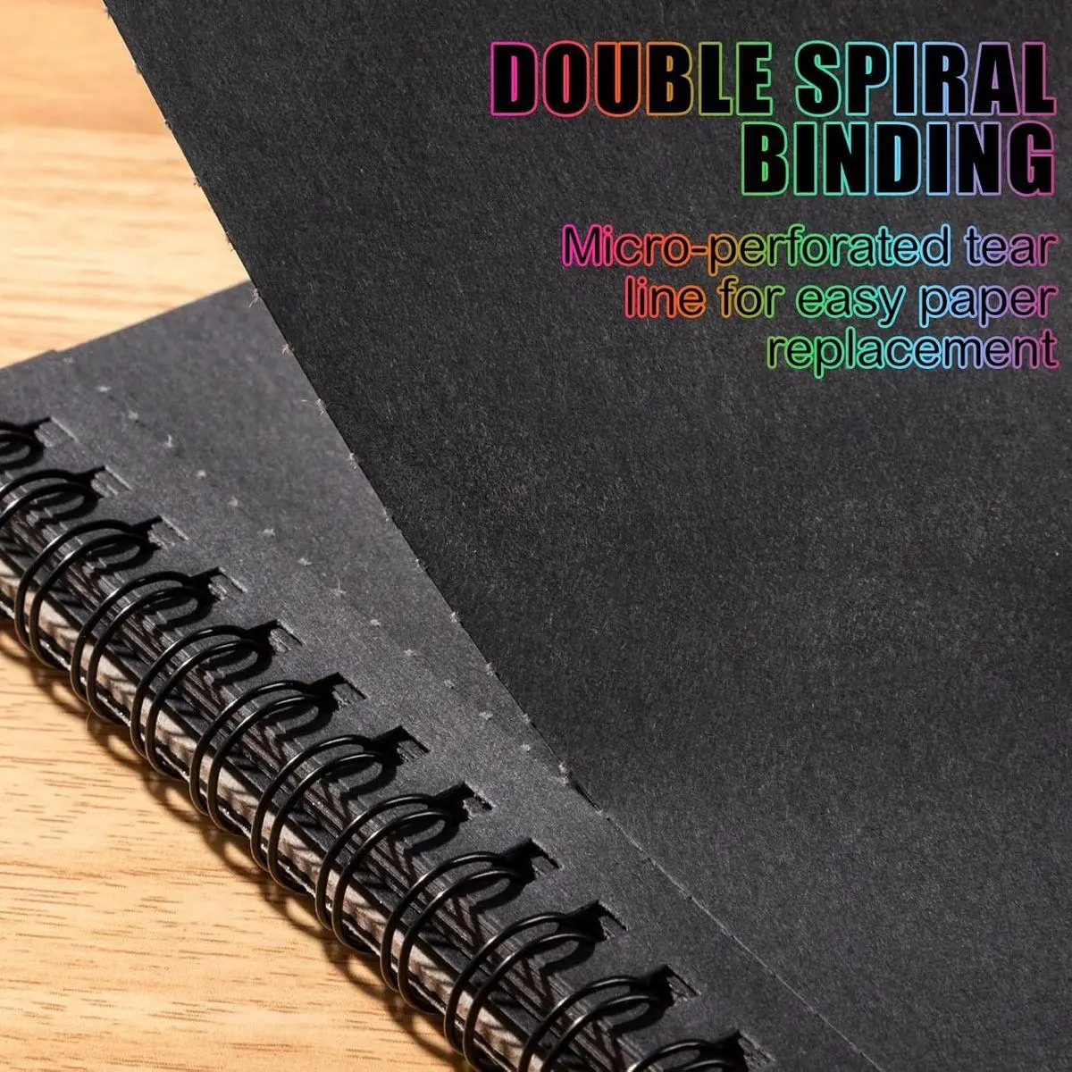 【Top Spiral Tear Design】This black paper notebook features a top reinforced spiral binding and can be laid flat at 180°. Built-in tear lines allow for clean page tearing without scissors. Compact size makes it easy to place on an easel, backpack or studio desk.