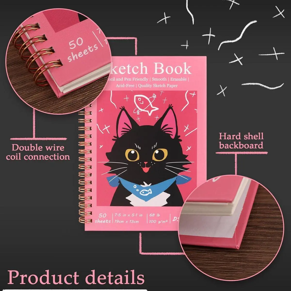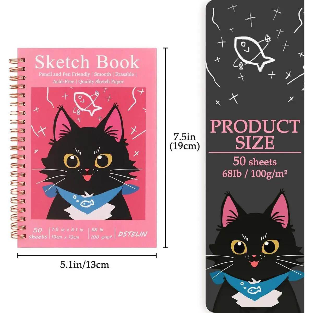 2-Pack DSTELIN Mini Sketchbooks with Black Cat Art : Spiral-bound, landscape-oriented (7.5 x 5.1 in / 19 x 13 cm) with vibrant pink hardcovers, each featuring a cute hand-drawn black cat illustration for a playful touch.