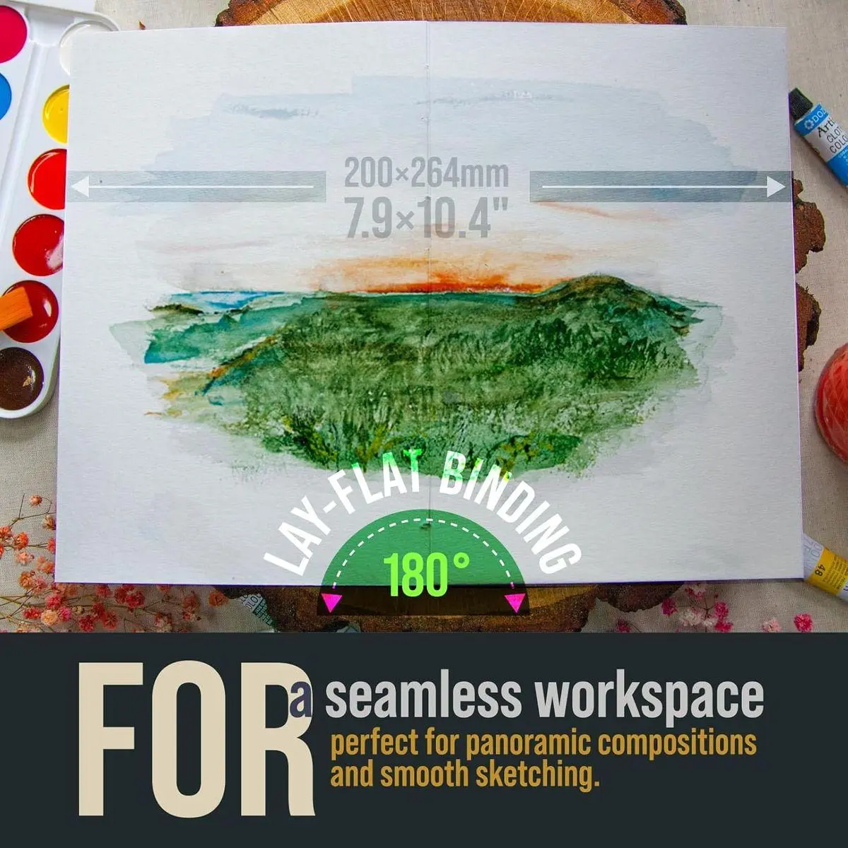 Seamless Lay-Flat Binding – Full Spread for Drawing, Painting & Journaling This A5 artist journal lays completely flat, giving you a wide 200×264mm (7.9×10.4") surface for expressive artwork. Perfect for two-page illustrations, sketchbook spreads, or mixed media journaling — whether in the studio or on the go.