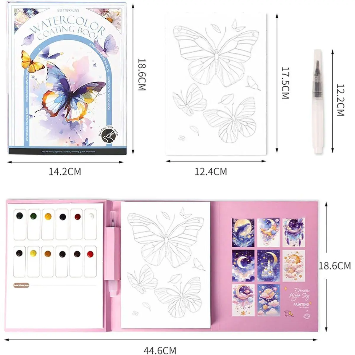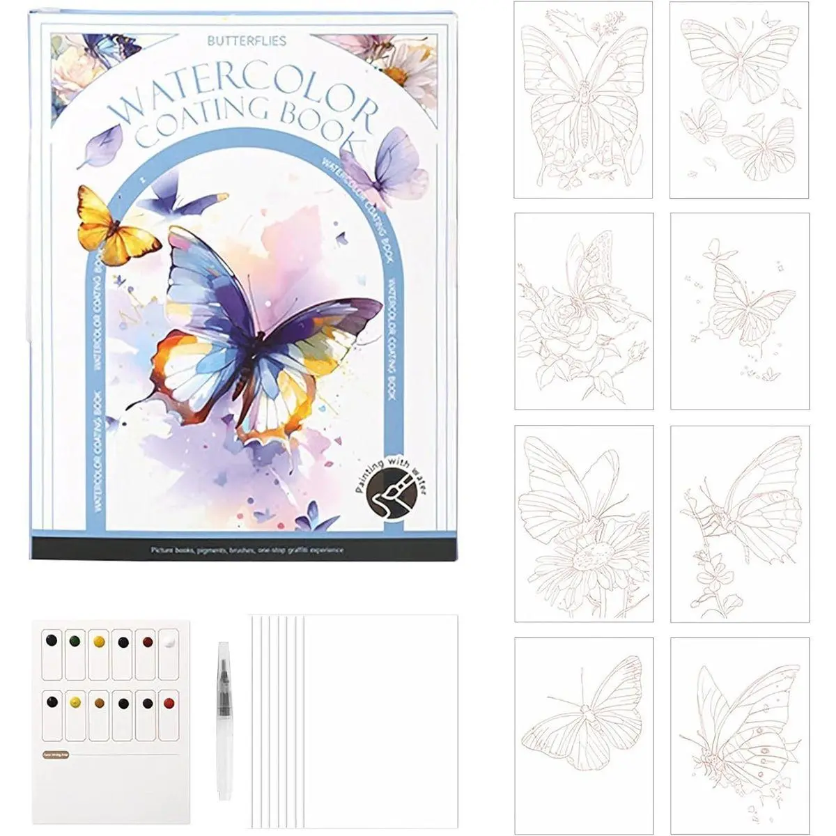 Included Components: watercolor paints (12 colors), brush, pre-drawn sketch page, blank pages, color reference guide, large-capacity brush