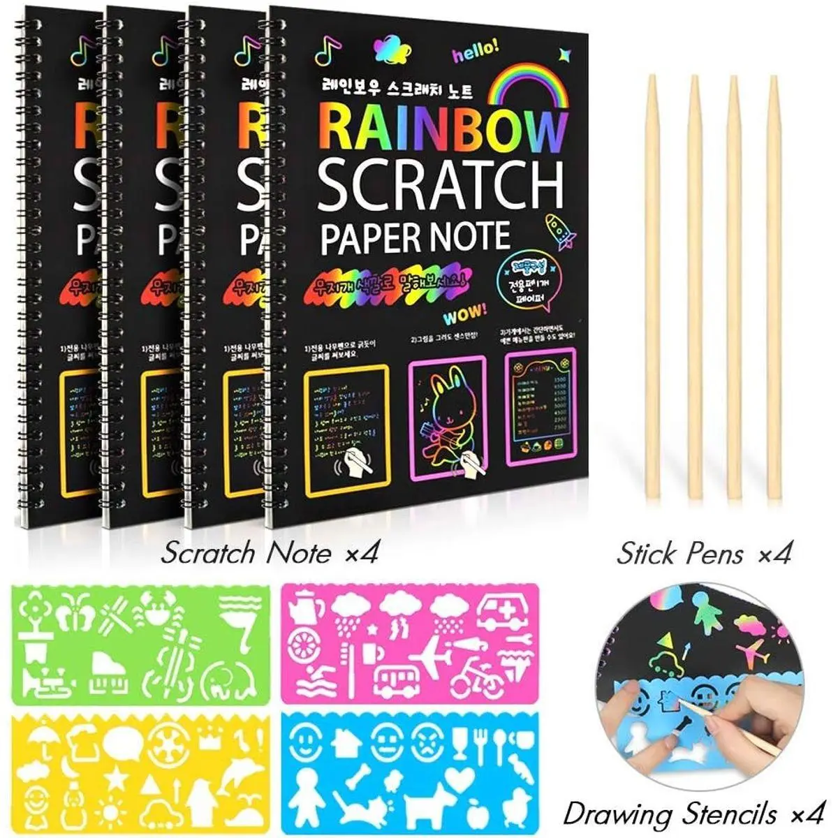 Scratch Art Kid Pacakge: The scratch drawing paper set includes 4 scratch art notebooks (Size: 7.48"*10.15"), 4 wooden styluses(Size: 5.55" long), and 4 drawing stencils (Size: 2.5"*5.9").