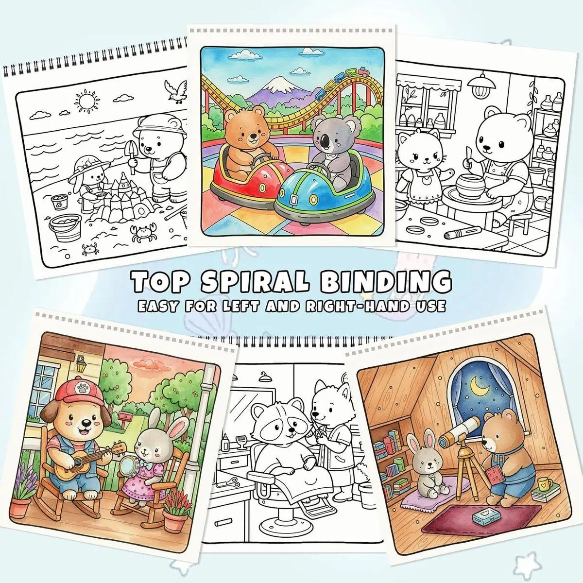 Cozy Coloring Book for Adults: Adorable Animal City Life Scenes Step into Fuzzy's cozy urban world—this adult coloring book features 32 heartwarming scenes of animals enjoying city life: rowing on lakes, flying in hot air balloons, having joyful picnics, picking coconuts, and more. With simple and soothing designs, it’s a perfect coloring book for adults to relax, de-stress, and spark creativity. This coloring book is a must-have for adult relaxation